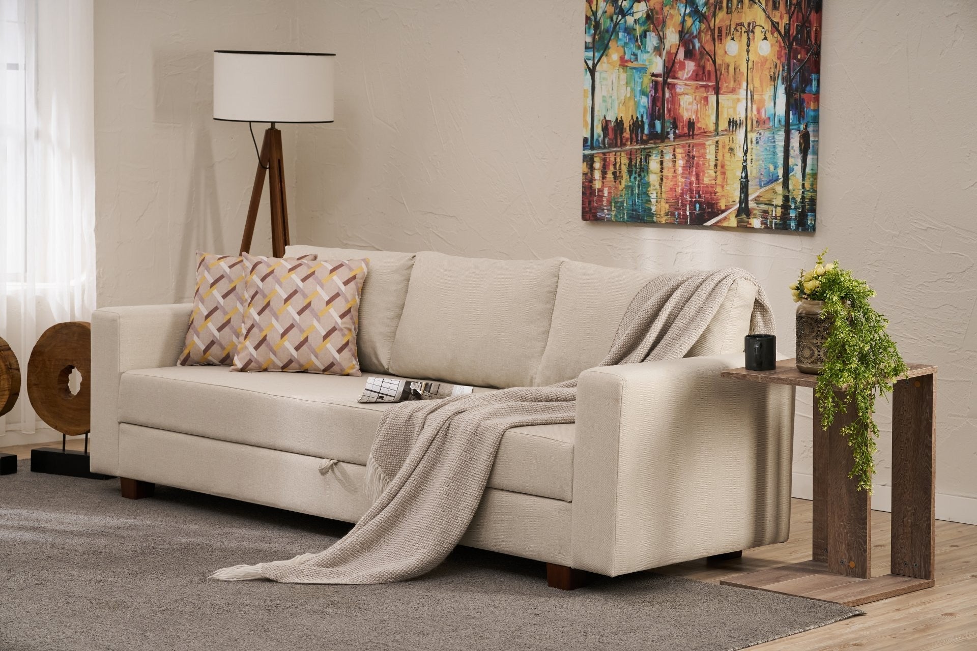 A 220 cm szélességgel és 190 x 80 cm-es fekvőfelülettel ez a kanapéágy könnyedén átalakul egy kényelmes alvóhellyé a vendégek számára. Az ülés alatti tárolódoboz elegendő helyet biztosít takarók, párnák és egyéb alapvető dolgok számára, így tökéletes kis lakóterekhez.