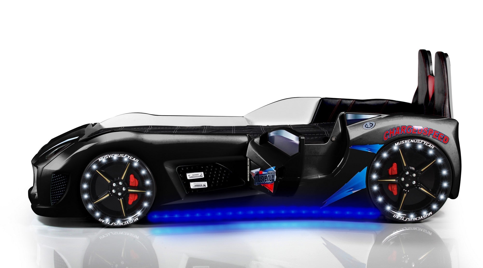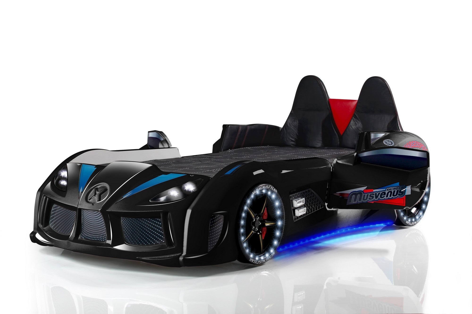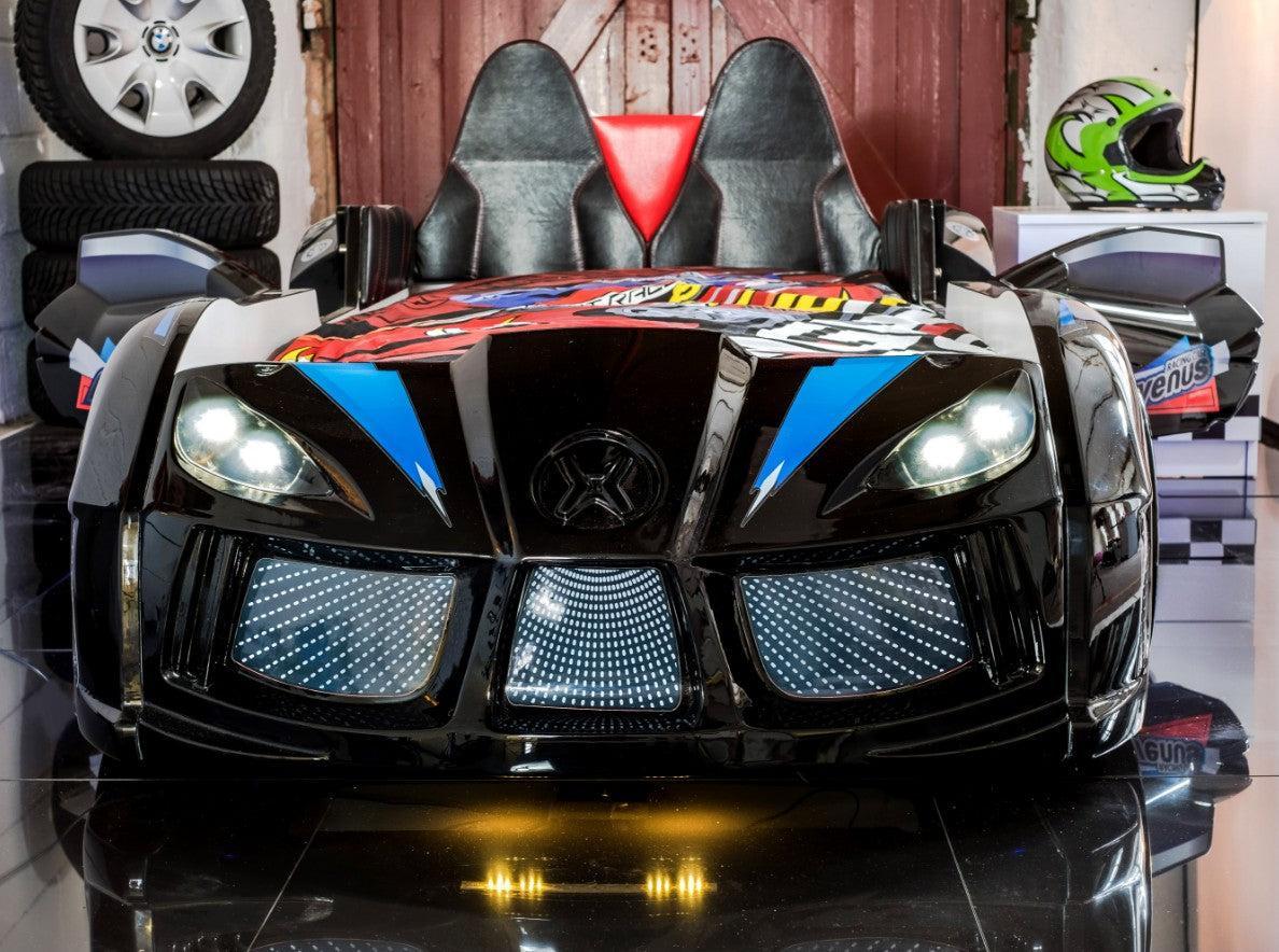 Képzeld el az örömöt gyermeked arcán, amikor bemászik a saját autós ágyába, amely működő ledes fényszórókkal és az autó alatt megbabonázó kék színben világító lámpákkal van felszerelve. A keréklámpák extra varázslatot adnak, lágy fehér fényükkel megvilágítva a szobát. A távirányítóval működtethető 4 típusú autózajjal gyermeked úgy érezheti, mintha a nyílt úton száguldozna, akár álmában is.