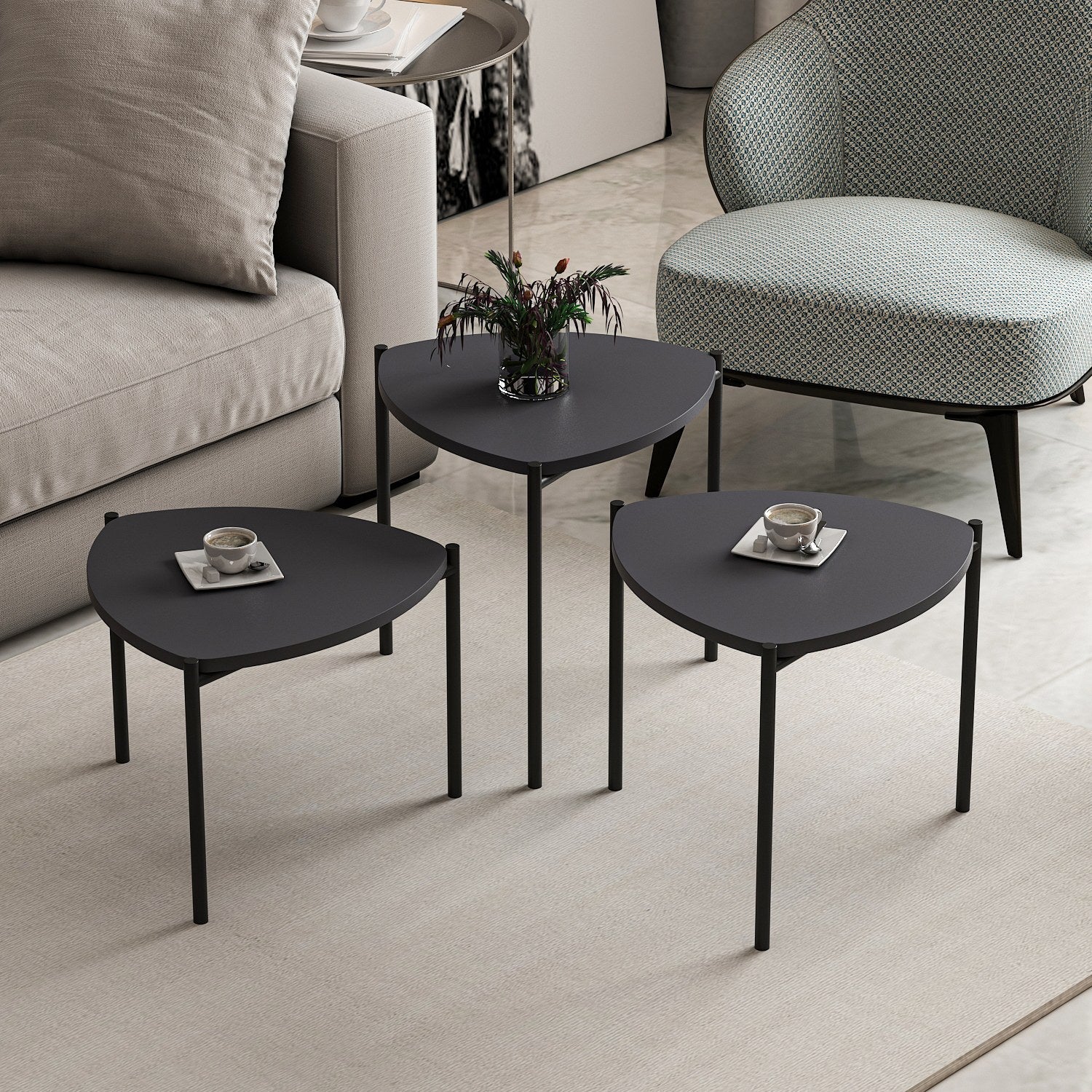 A készlet három fészekrakó asztalt tartalmaz, mindegyik különböző magasságú. Ez lehetővé teszi, hogy külön-külön használja őket, vagy egymásra rakja őket, hogy helyet takarítson meg, amikor nem használja őket. Az egyes asztalok kompakt méretének (45 cm szélesség, 45 cm mélység) köszönhetően ideálisak kis lakásokba vagy szűk helyiségekbe.
