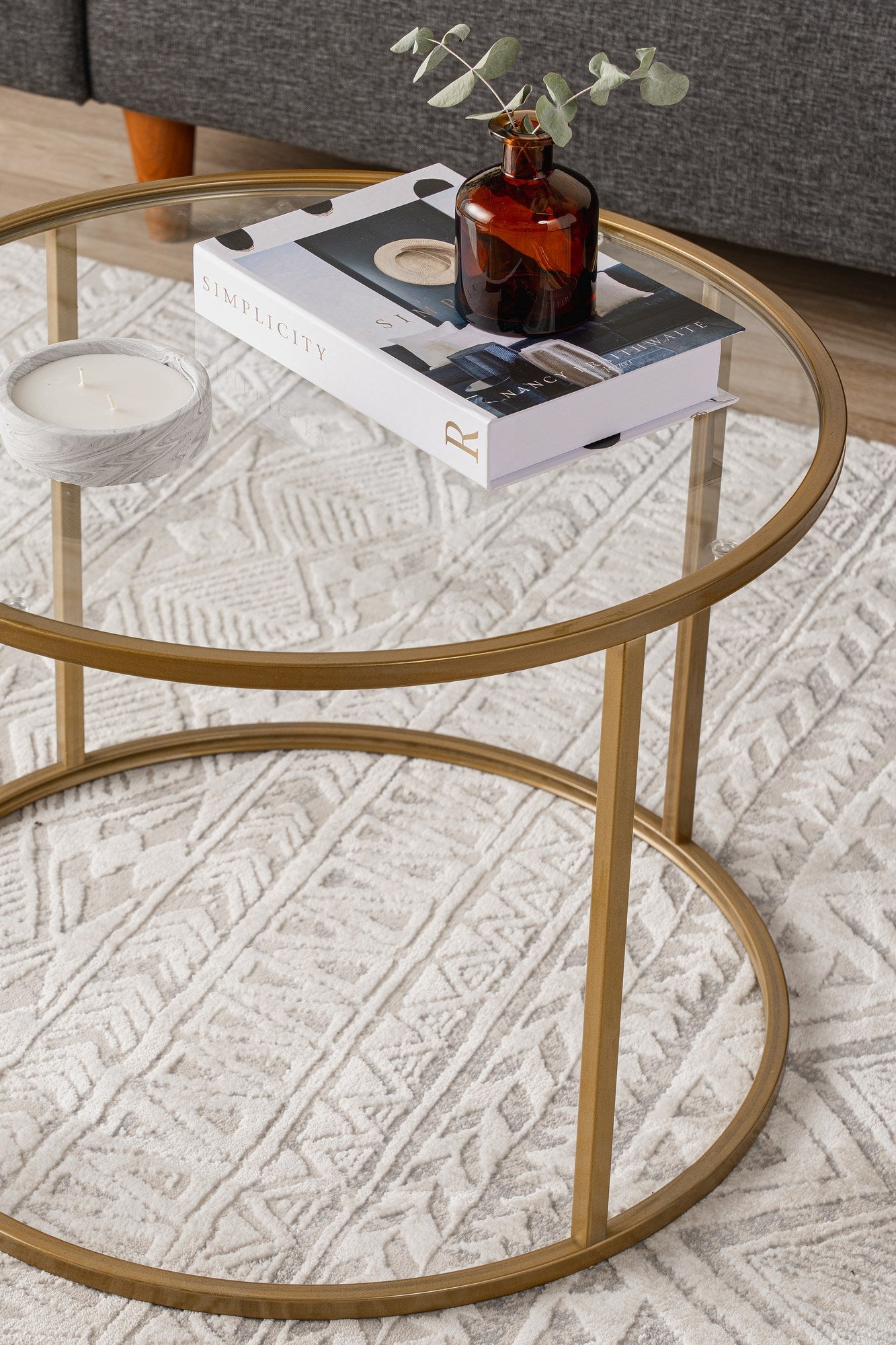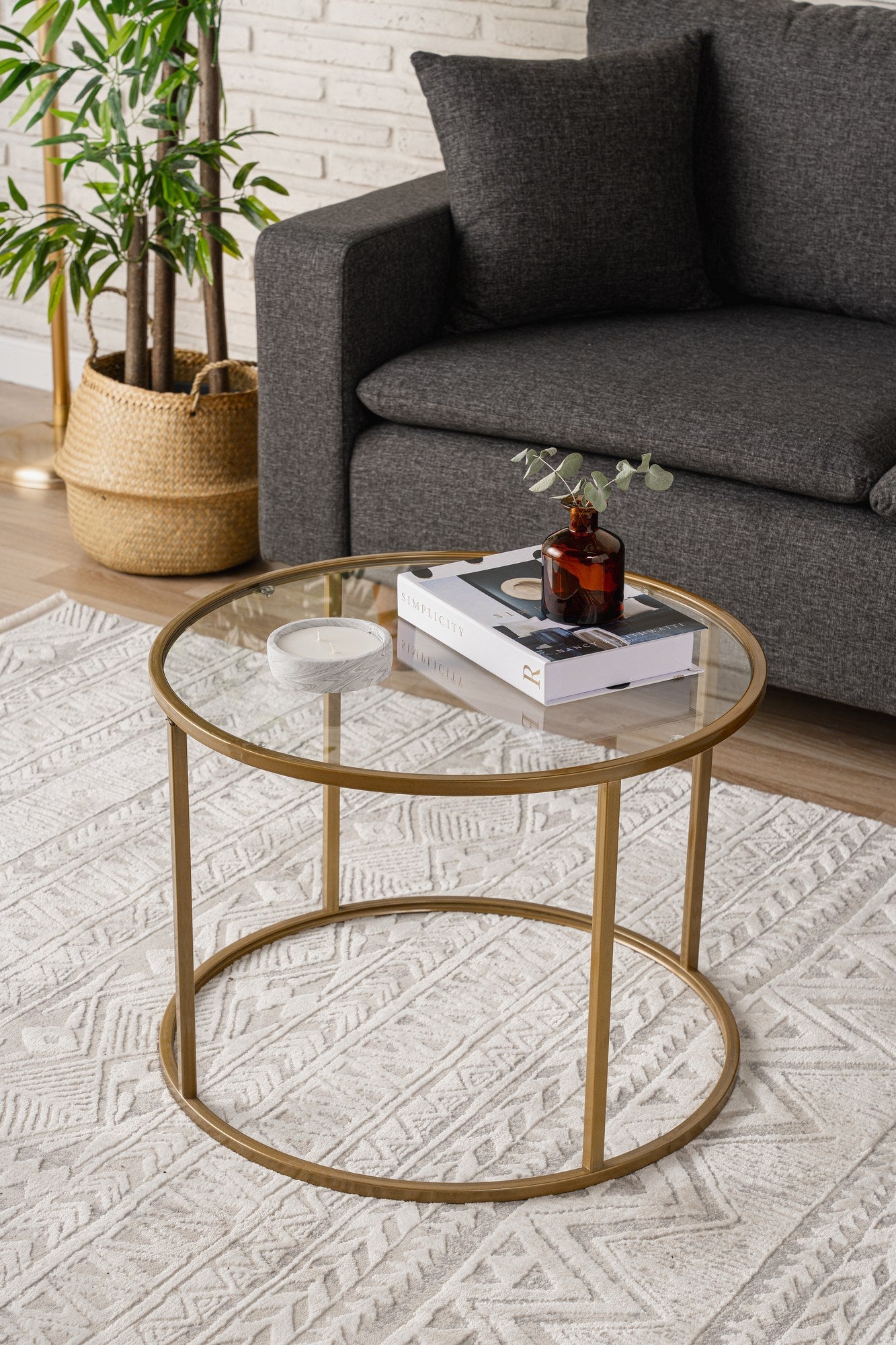 Alakítsa át életterét lenyűgöző Arany Kávézóasztalunkkal. 100%-ban edzett üvegből és fémből készült, ez a darab eleganciát és kifinomultságot sugároz. A letisztult dizájn és a luxus arany bevonat azonnal feldobja bármely helyiség megjelenését, így tökéletes középpontja otthonának.