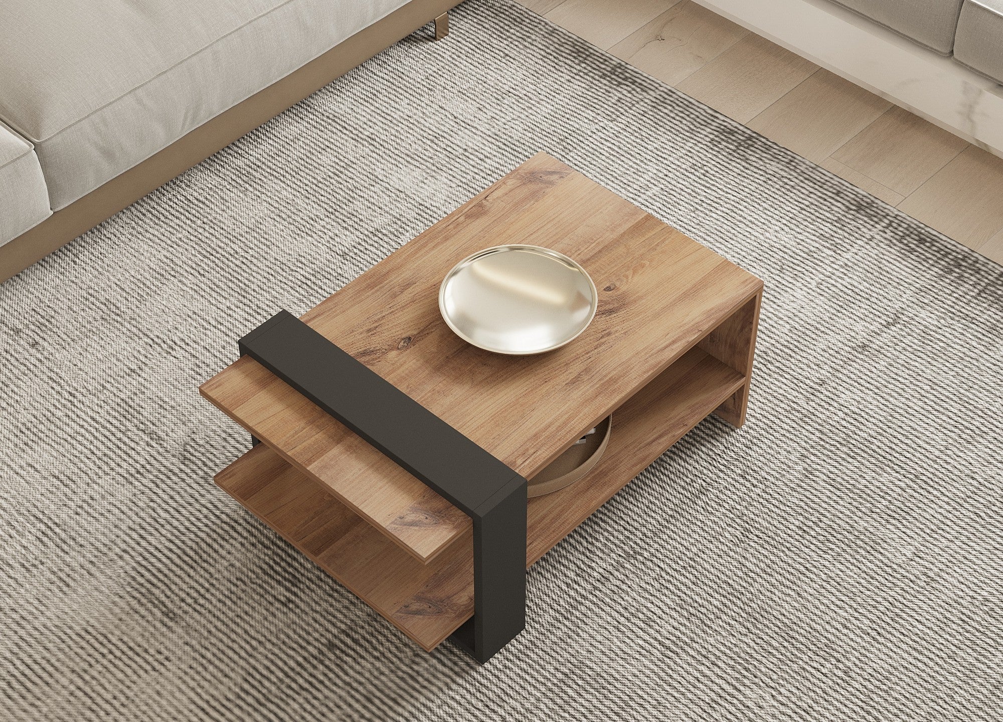 A tölgy és az antracit szín kombinációja egyedi és ipari megjelenést kölcsönöz ennek a dohányzóasztalnak, így tökéletes kiegészítője lehet bármilyen kortárs vagy modern dekorációnak. A 2 szintes kialakításának köszönhetően extra funkcionalitást biztosít, így könnyedén kiállíthatja kedvenc dísztárgyait, vagy tárolhatja alapvető dolgait.