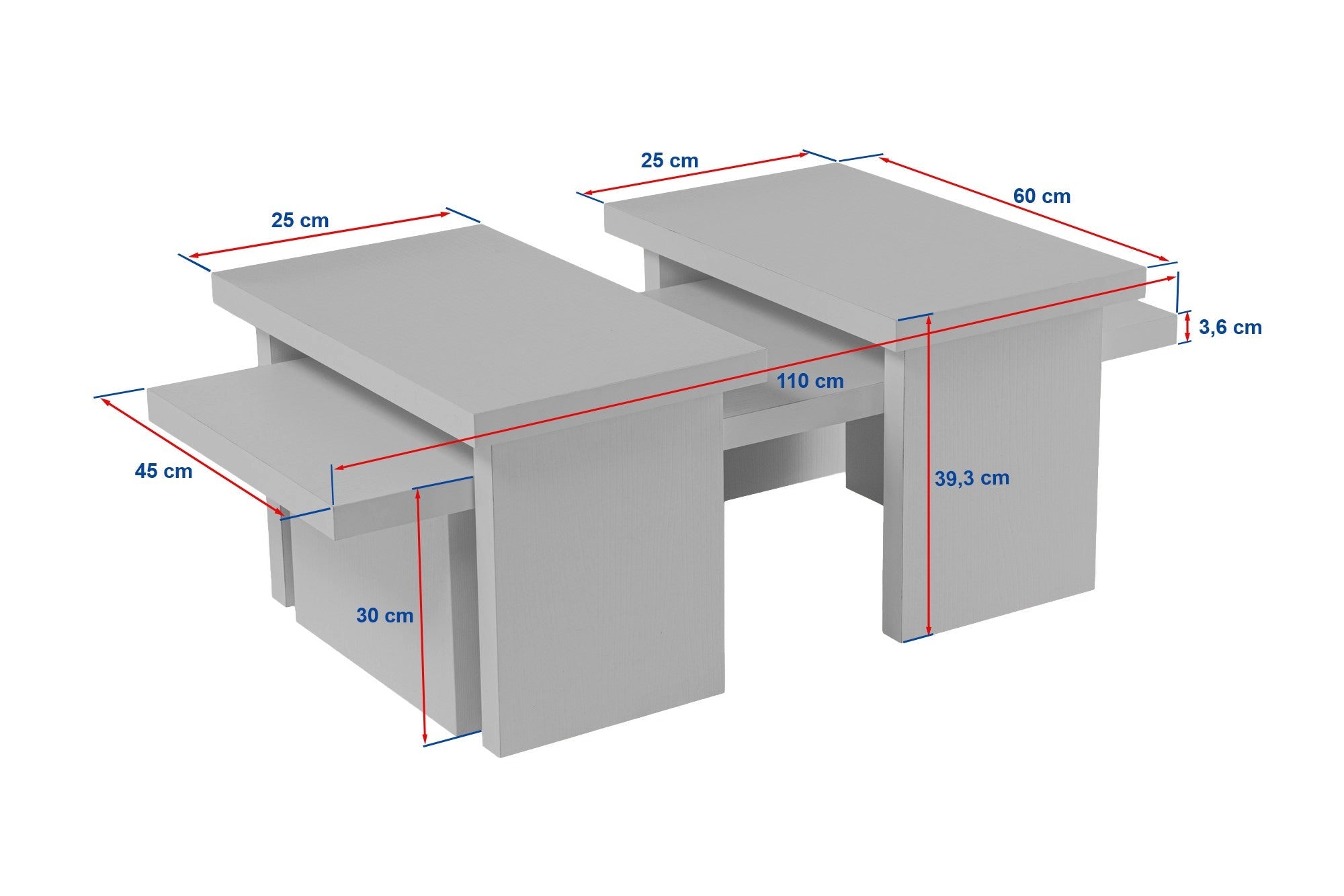 A szett egy nagy asztalt és egy kis asztalt tartalmaz, amelyek elegendő helyet biztosítanak a dekorációk kiállítására, a szükséges dolgok tárolására, vagy egyszerűen a reggeli kávé élvezetére. A különböző méretek lehetővé teszik a stílus és a elhelyezés rugalmasságát, így könnyen testre szabhatja a terét.
