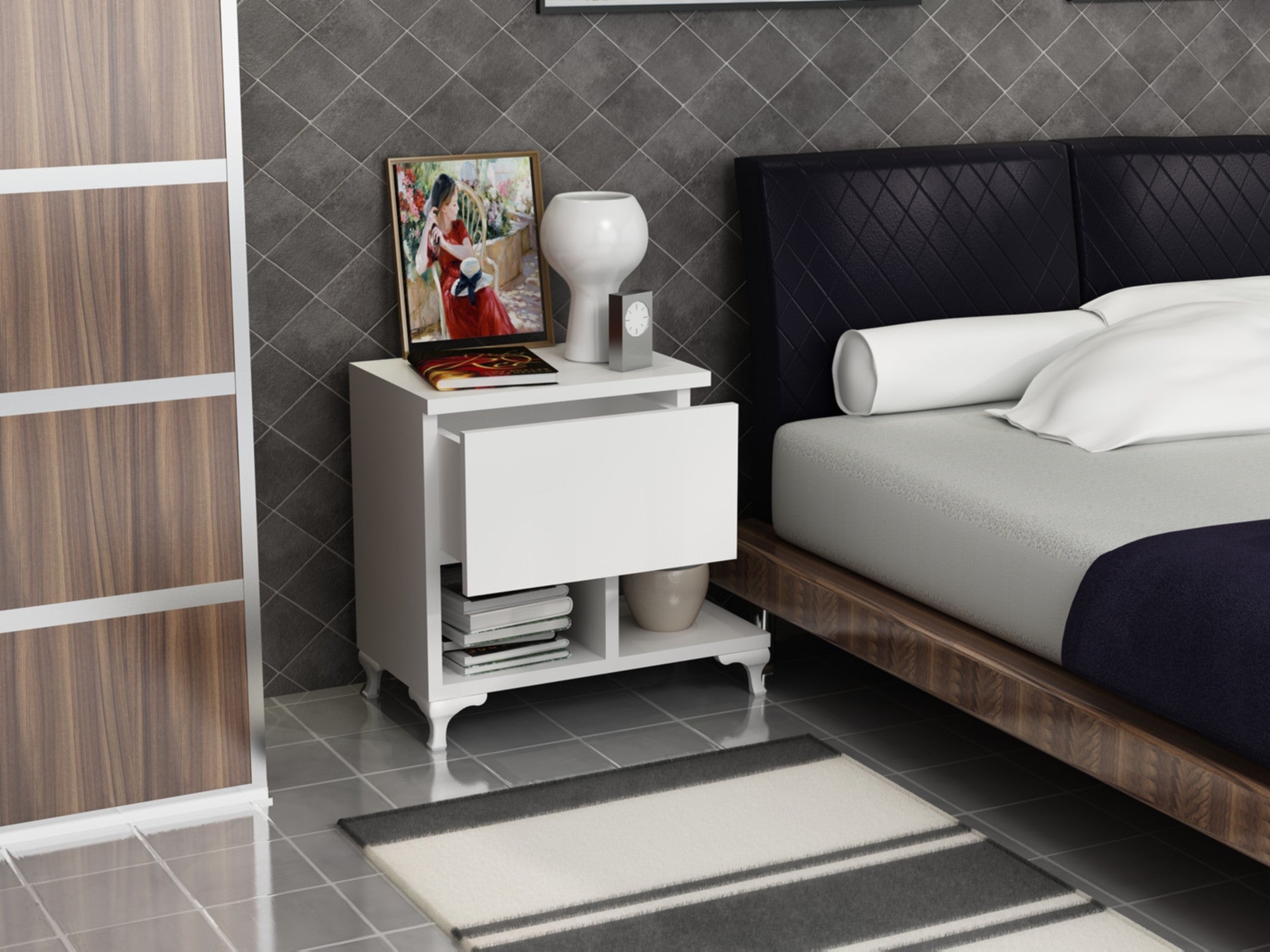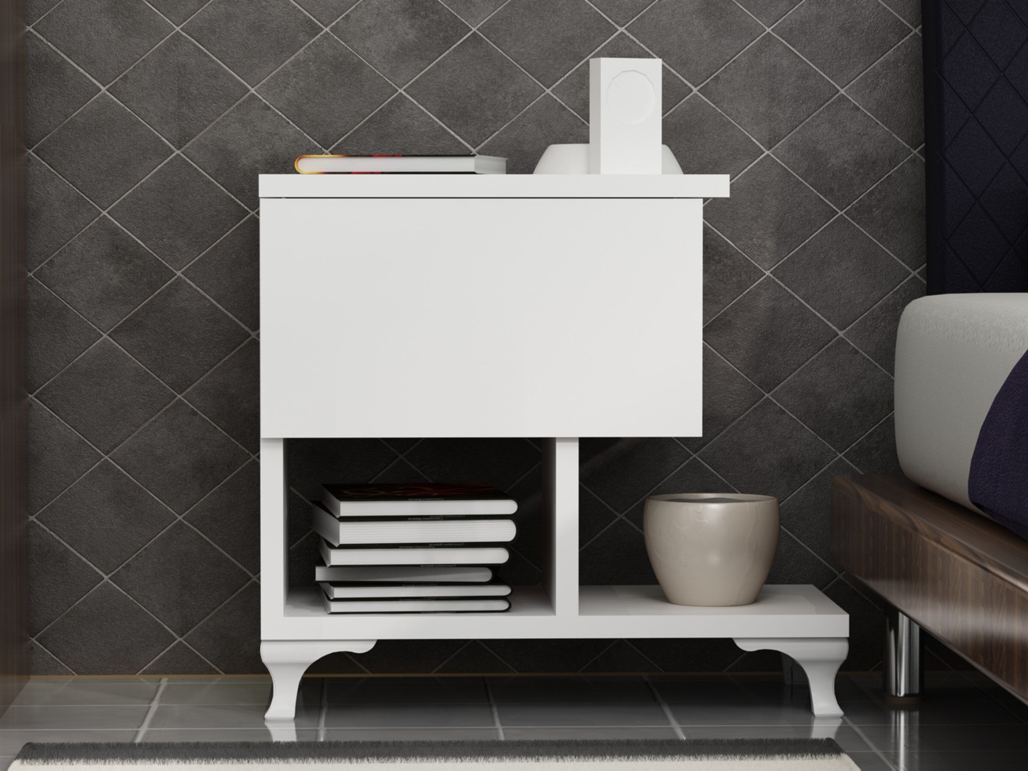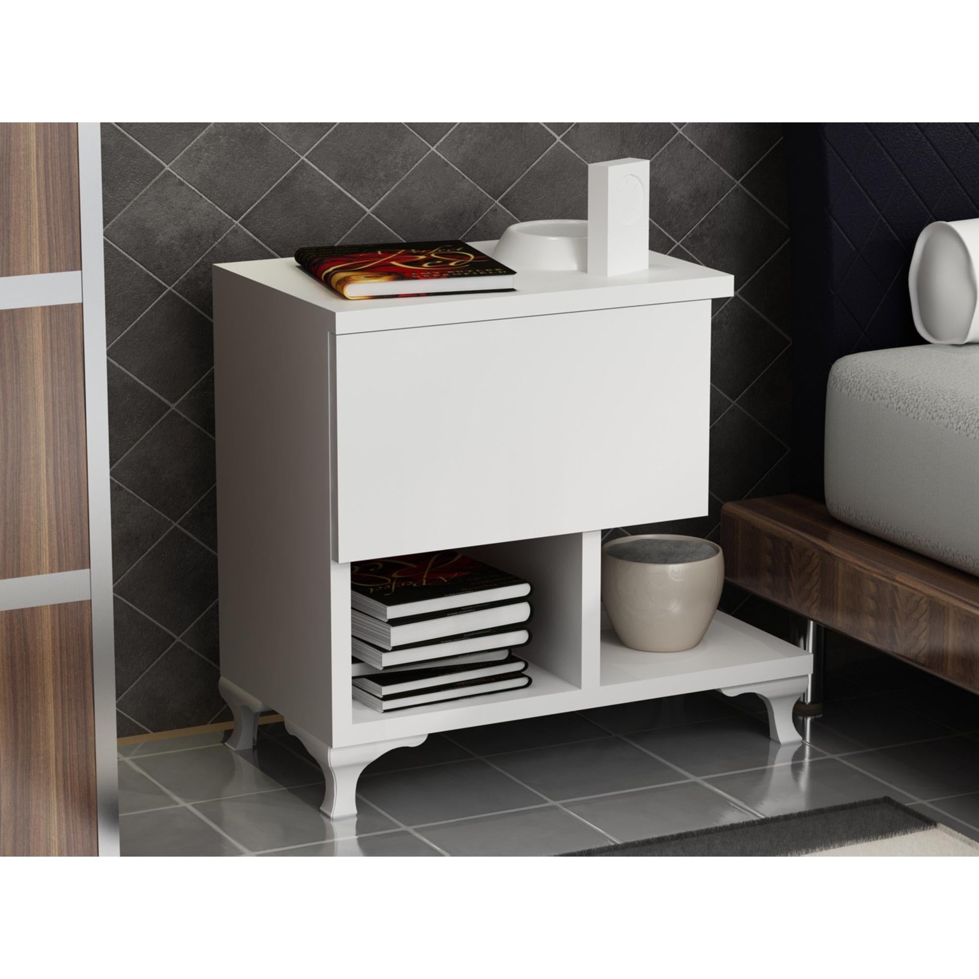 Ez az éjjeliszekrény nem csak esztétikus, hanem rendkívül sokoldalú is. Könnyen rögzíthető a falhoz, így maximalizálhatja a helyét, és zökkenőmentes megjelenést teremthet hálószobájában. Az egyszerű, egyszínű fehér szín egy csipetnyi kifinomultságot kölcsönöz, könnyedén illeszkedik bármilyen meglévő dekorációhoz.