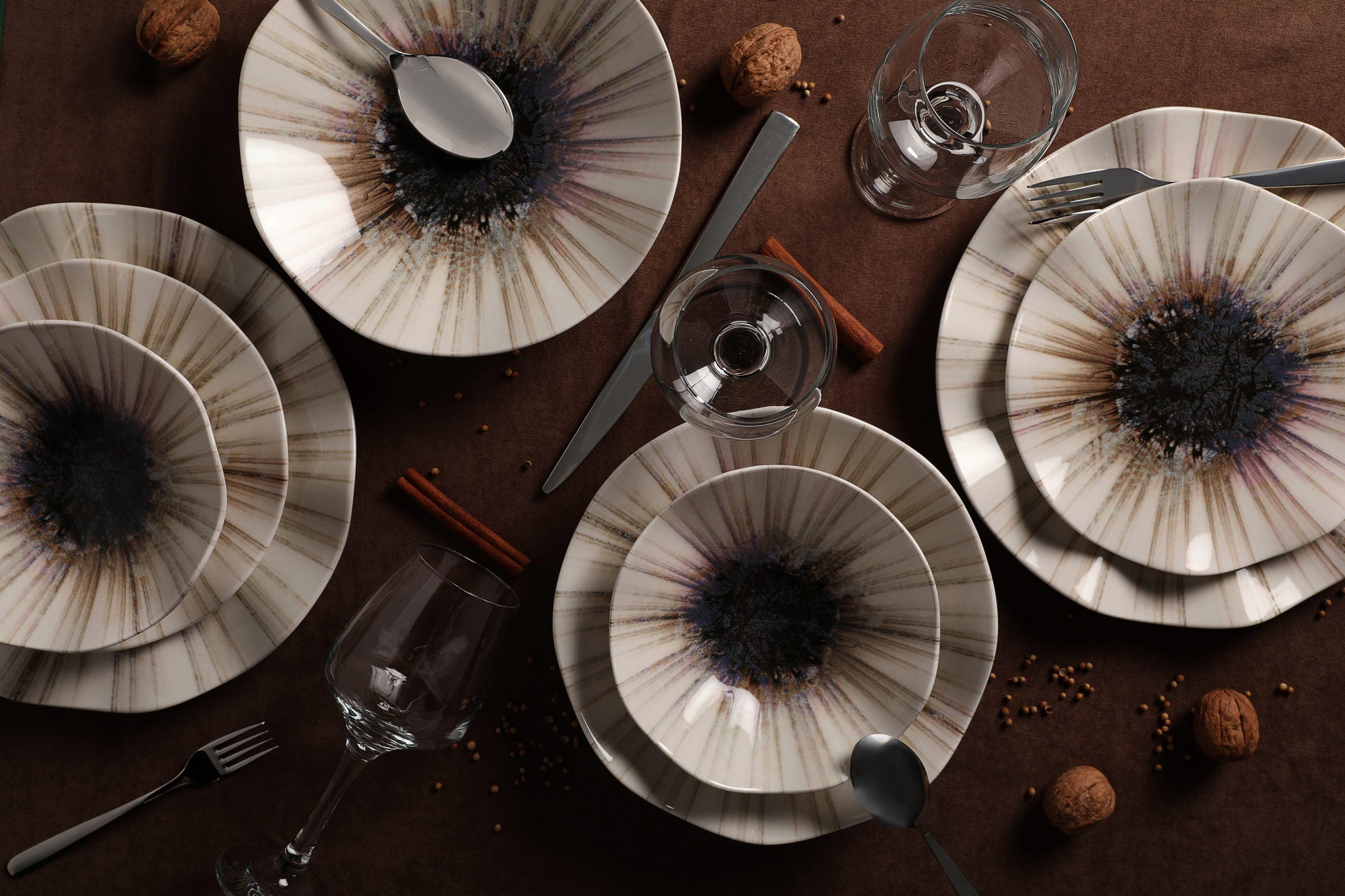 Kényeztesse magát a végső étkezési élménnyel 24 darabos porcelán étkészletünkkel. A legnagyobb gondossággal és precizitással készült étkészletet úgy terveztük, hogy egy csipetnyi eleganciát és kifinomultságot kölcsönözzön asztalának.