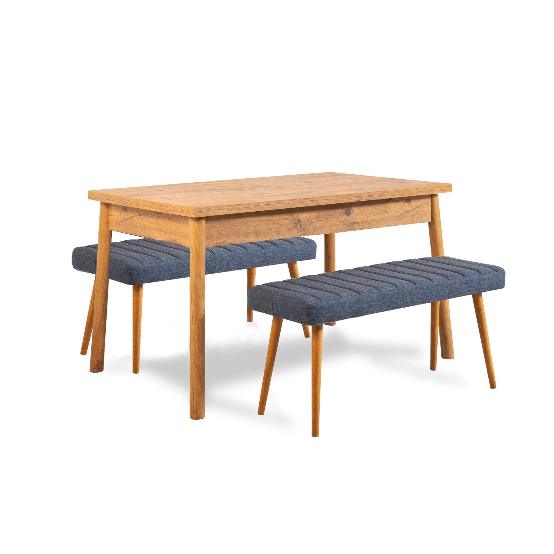 Az étkezőasztal és az atlanti fenyőben és a sötétkék színekben lévő padok karcsú kialakítása azonnali kifinomultságot ad az étkezőjéhez. A tiszta vonalak és a minimalista esztétika teszi ezt a készletet minden modern otthoni dekorációhoz.