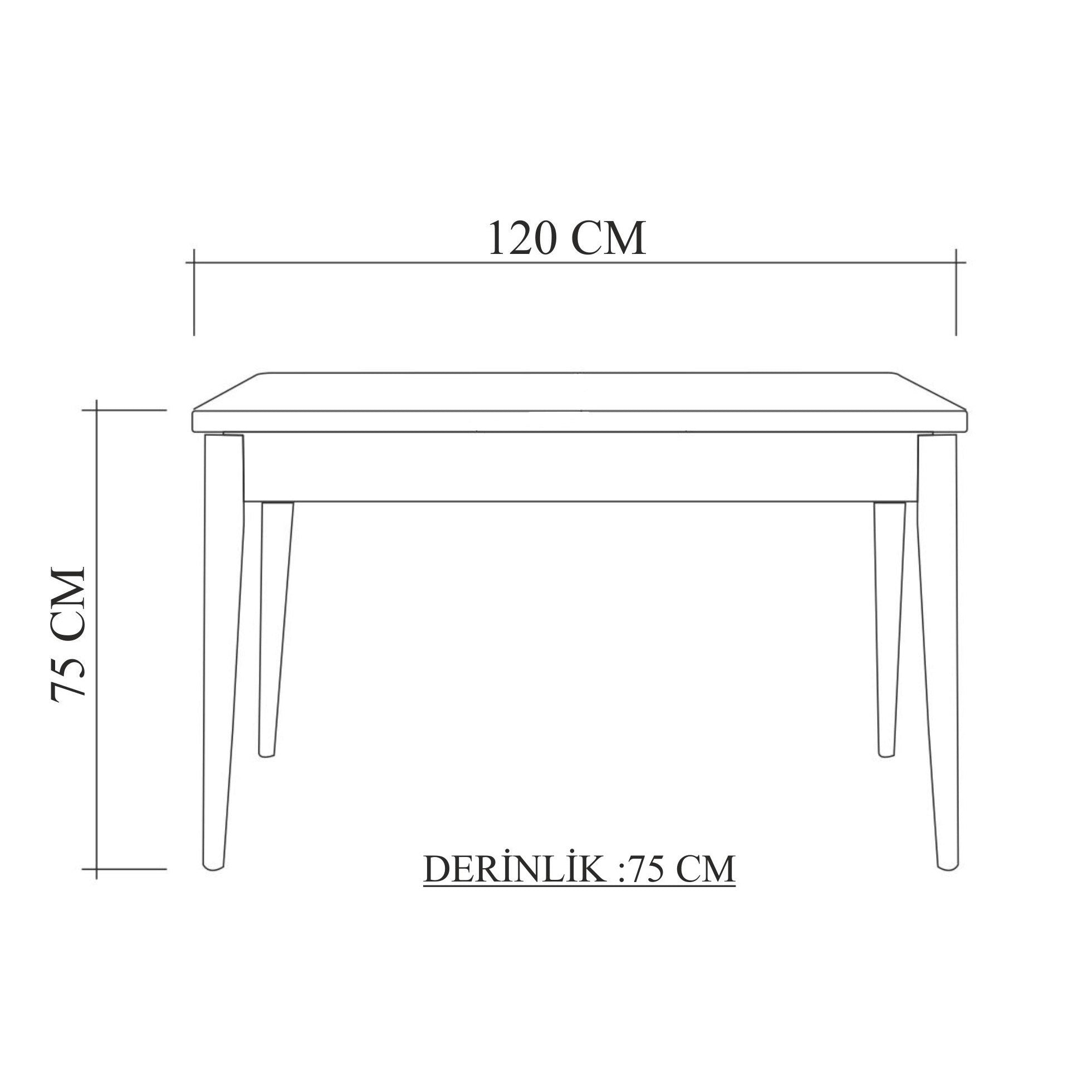 - Étkezőasztal mérete: Szélesség: 120 cm, magasság: 75 cm, mélység: 75 cm (1 darab)