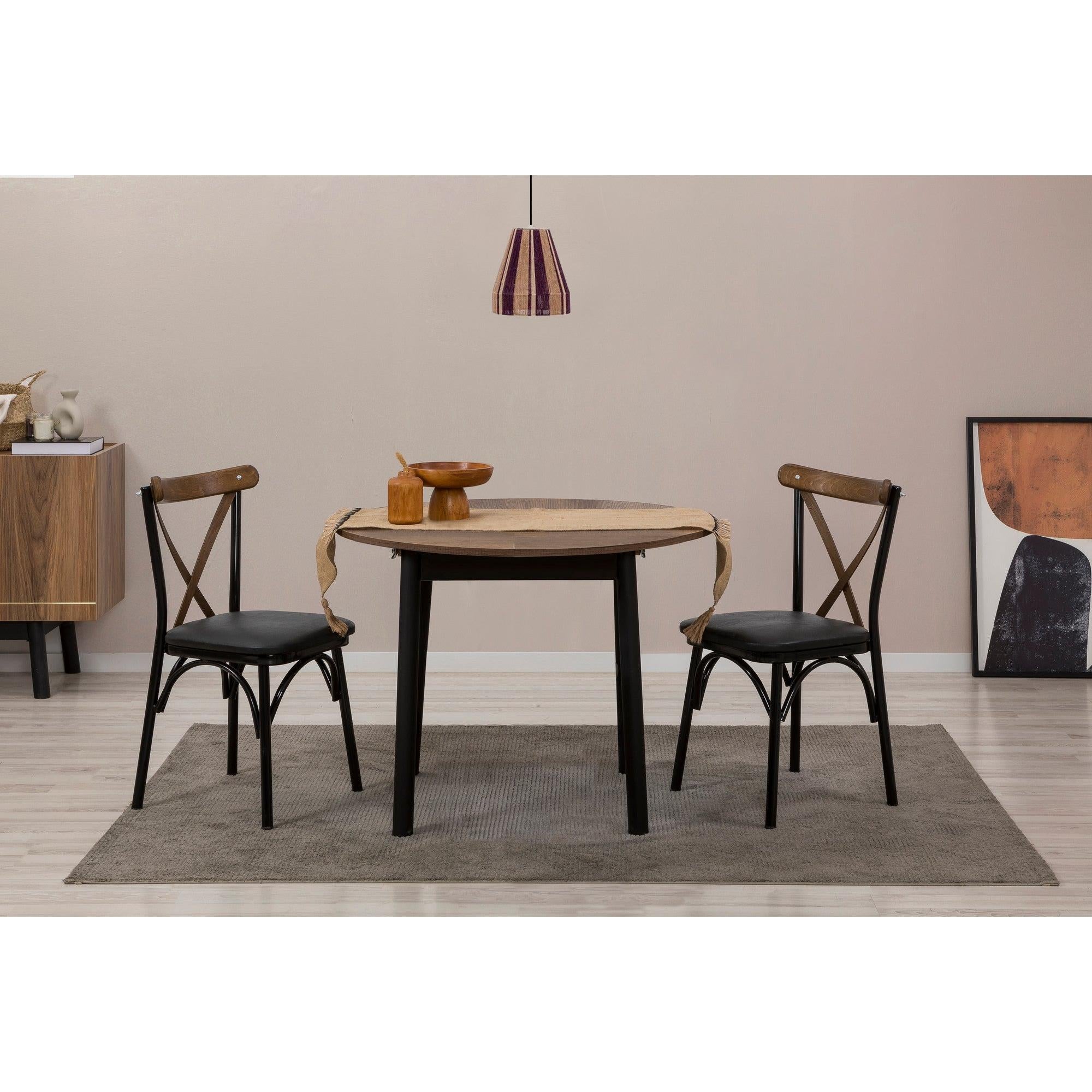 A szett elegáns fekete és dió színei egy csipetnyi kifinomultságot adnak bármely étkezőhöz. Az asztal és a székek fából készült lábai stabil alapot biztosítanak minden étkezési igényhez.