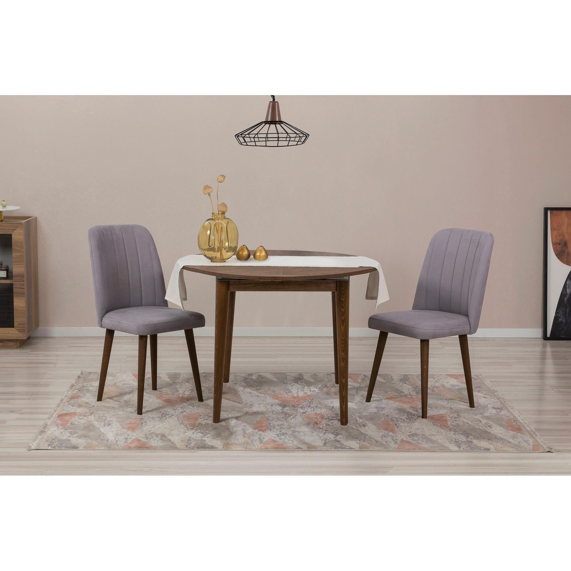 Ennek az étkezőszettnek a letisztult dizájnja azonnal feldobja az étkező terét. A dió és szürke színkombináció modern érintést ad bármilyen dekorációnak, míg a fa lábak stabil alapot biztosítanak az asztalnak és a székeknek.