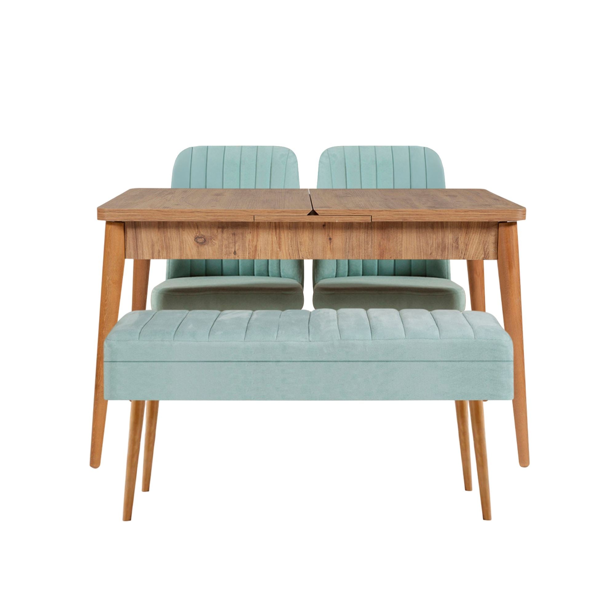 A 100% melaminbevonatú forgácslapból készült étkezőgarnitúra nemcsak tartós, hanem kifinomultságot is sugároz. Az atlanti fenyő és a pisztácia zöld színei zökkenőmentesen keverednek, eleganciát kölcsönözve bármely helyiségnek.