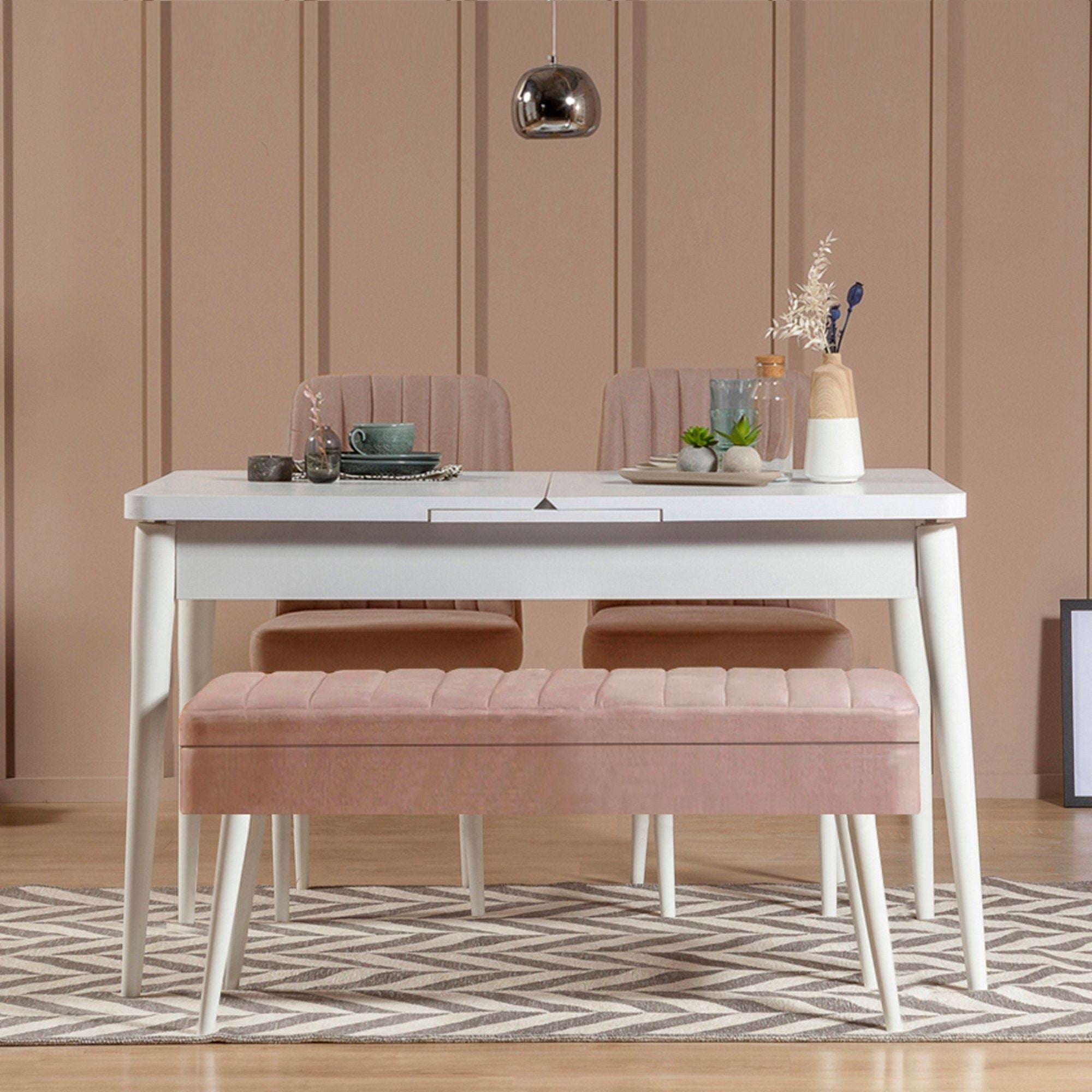 Kiterjeszthető kialakításának köszönhetően étkezőasztalunk könnyedén alkalmazkodik az Ön igényeihez. Akár egy meghitt, két személyre szóló vacsorát, akár egy nagyobb összejövetelt rendez, egyszerűen nyissa ki az asztalt teljes méretére, és mindenki kényelmesen elfér. A készlet két széket és egy padot is tartalmaz, így bőséges ülőhelyet biztosít vendégei számára.