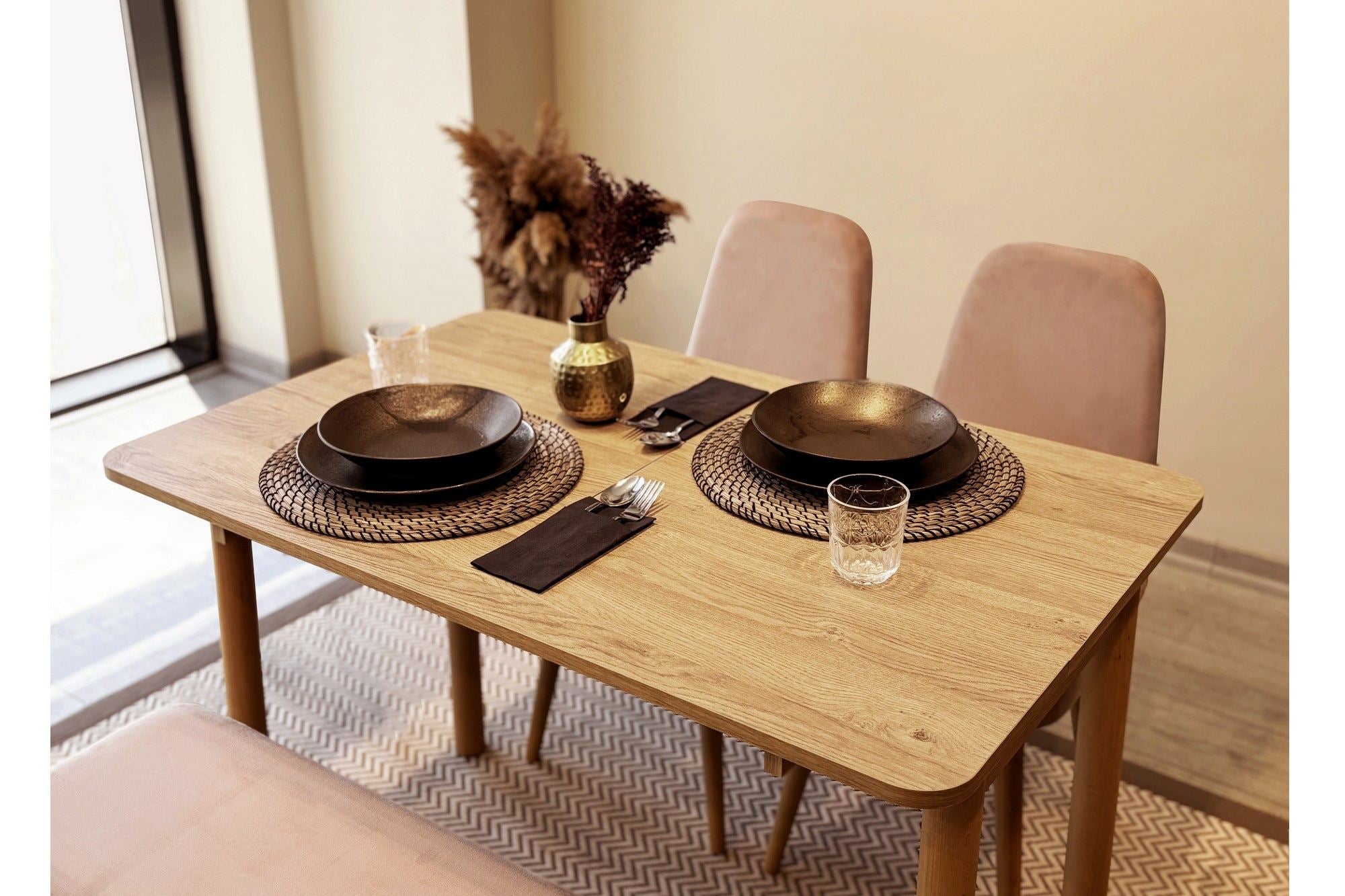 Ennek az étkezőszettnek a letisztult és modern dizájnja emeli az étkezője megjelenését, barátságos légkört teremtve a család és a vendégek számára. A tölgy és kő színek zökkenőmentesen illeszkednek bármilyen dekorációs stílushoz, egy csipetnyi kifinomultságot adva a térhez.