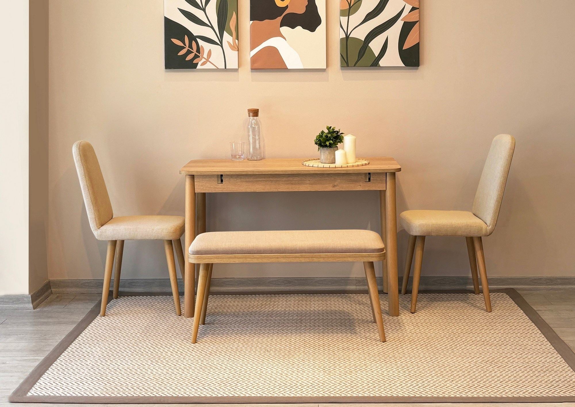 Az étkezőasztal sima tölgyfa felülettel rendelkezik, amelyet krémszínű székek és egy illeszkedő pad egészít ki. Ez a szett könnyedén feldobja az étkezője megjelenését, így tökéletes helyszín a családi és baráti összejövetelekhez, étkezésekhez és beszélgetésekhez.