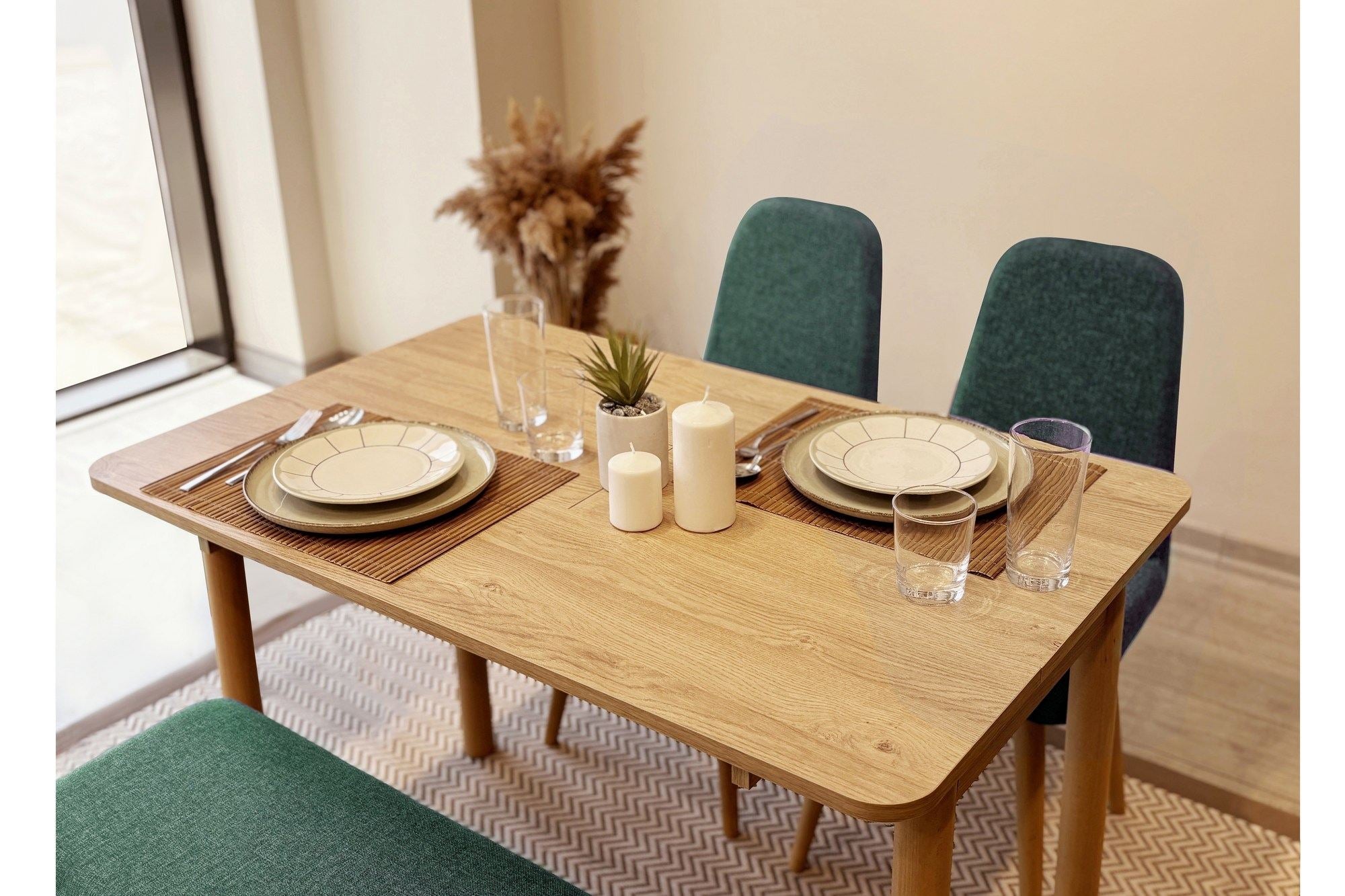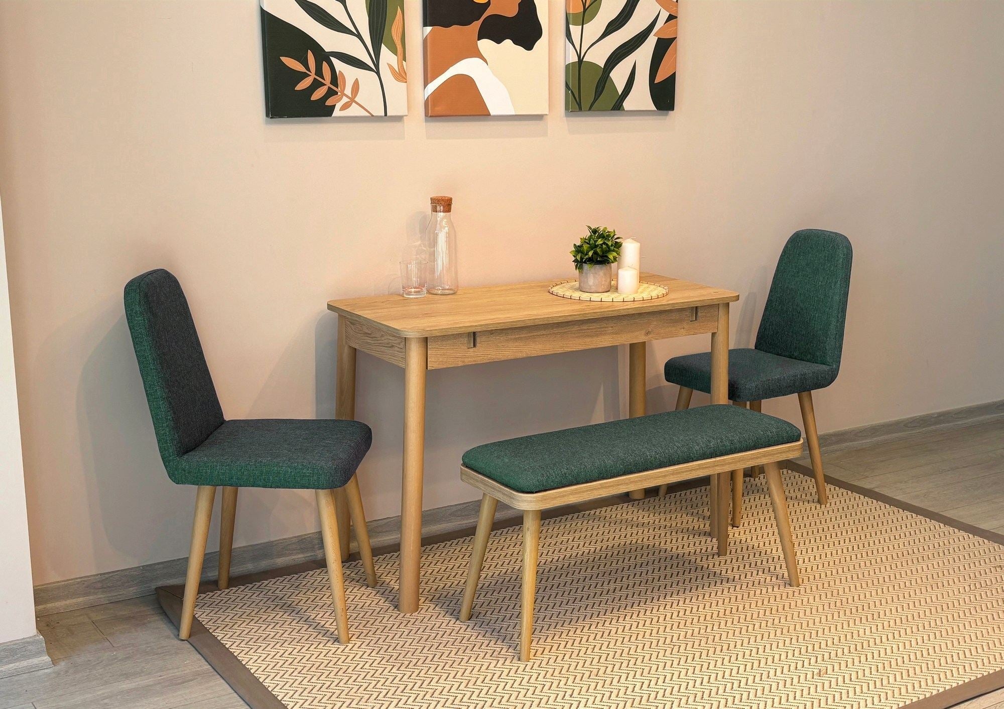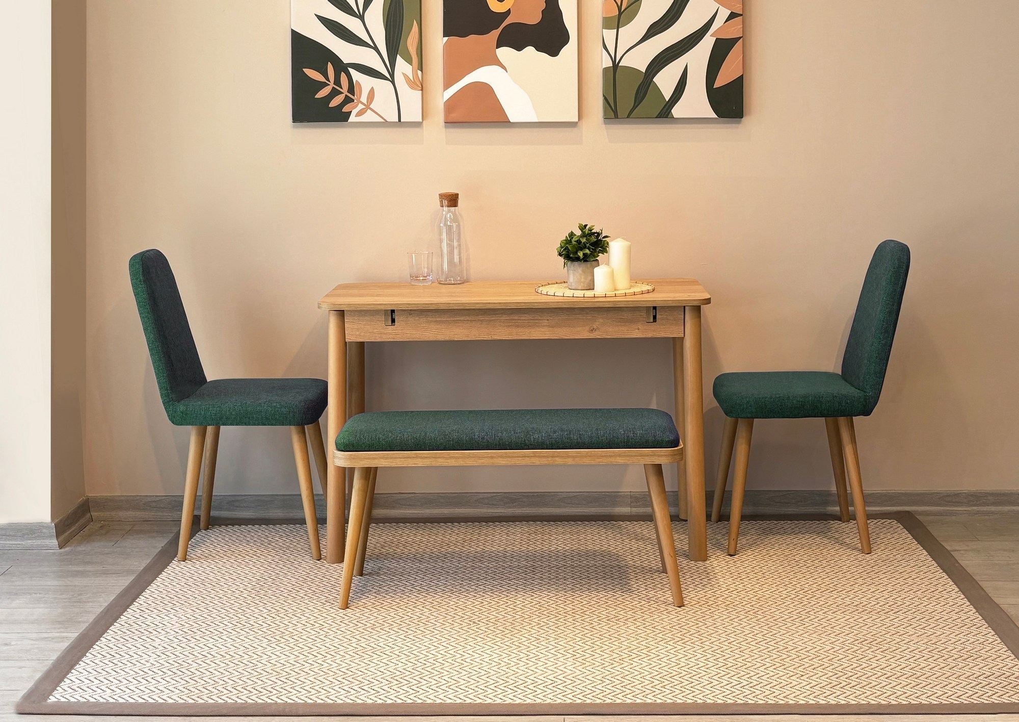 A székek és az asztal sima tölgyfurnérja egy csipetnyi kifinomultságot ad bármely étkezőhelyiséghez, míg a székek zöld színe modern csavart visz a szettbe. Akár vacsorapartit rendez, akár családi étkezést élvez, ez a szett meleg és barátságos légkört teremt a vendégei számára.
