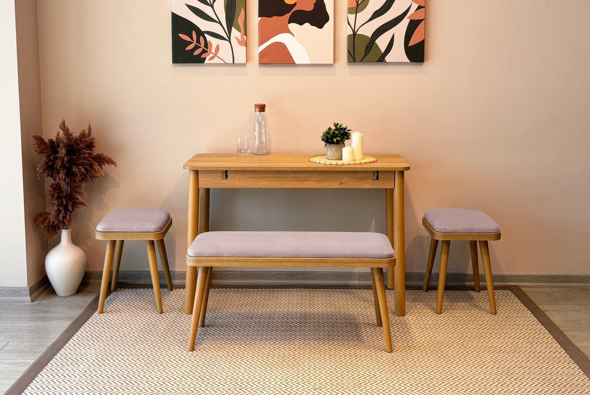 Tökéletes méret: Az étkezőasztal 110 cm szélességű, 75 cm magas és 50 cm mélységű, míg a széklet és a padot úgy tervezték, hogy tökéletesen illeszkedjenek az asztal körül, és koherens megjelenést teremtsenek.