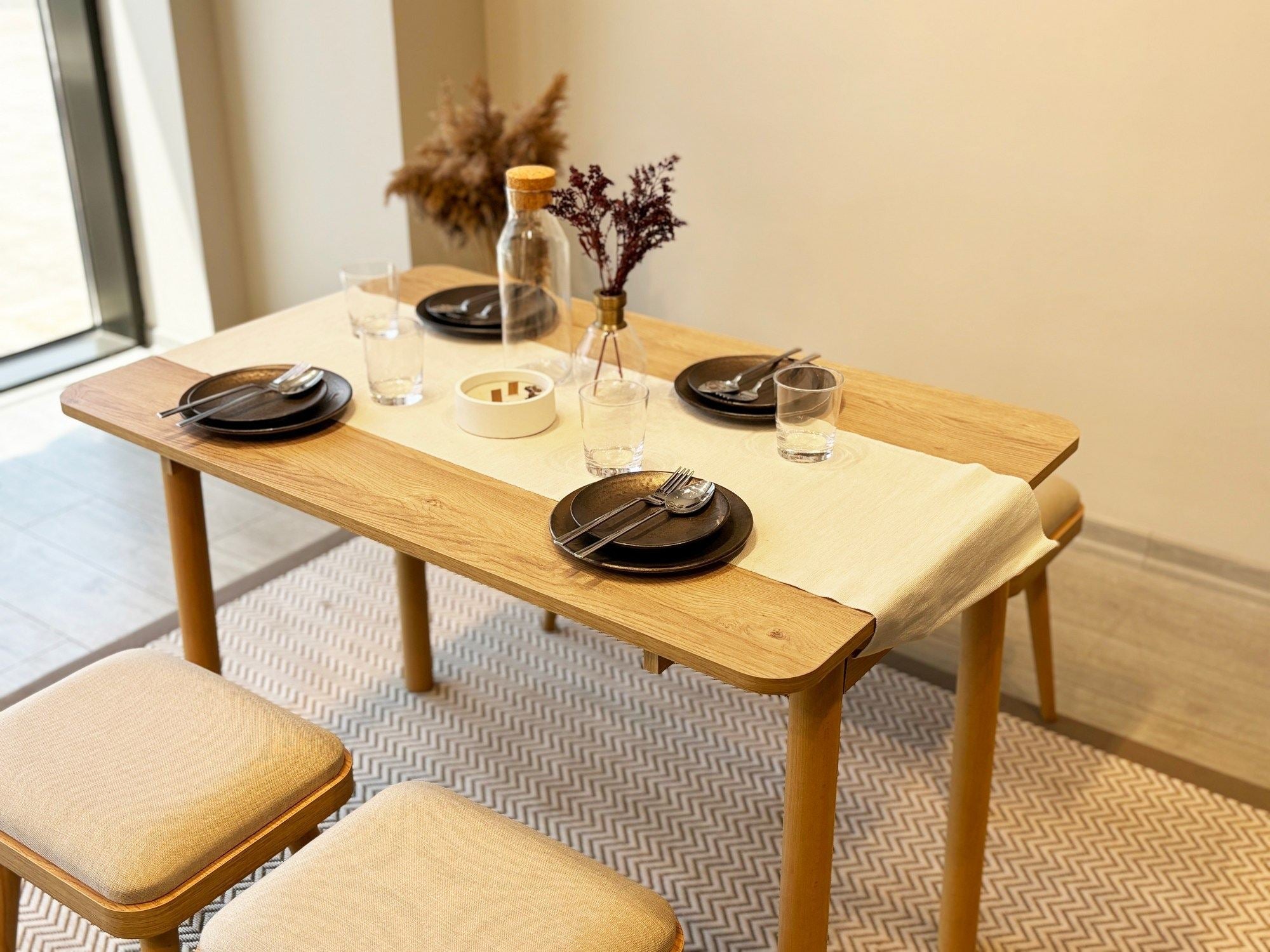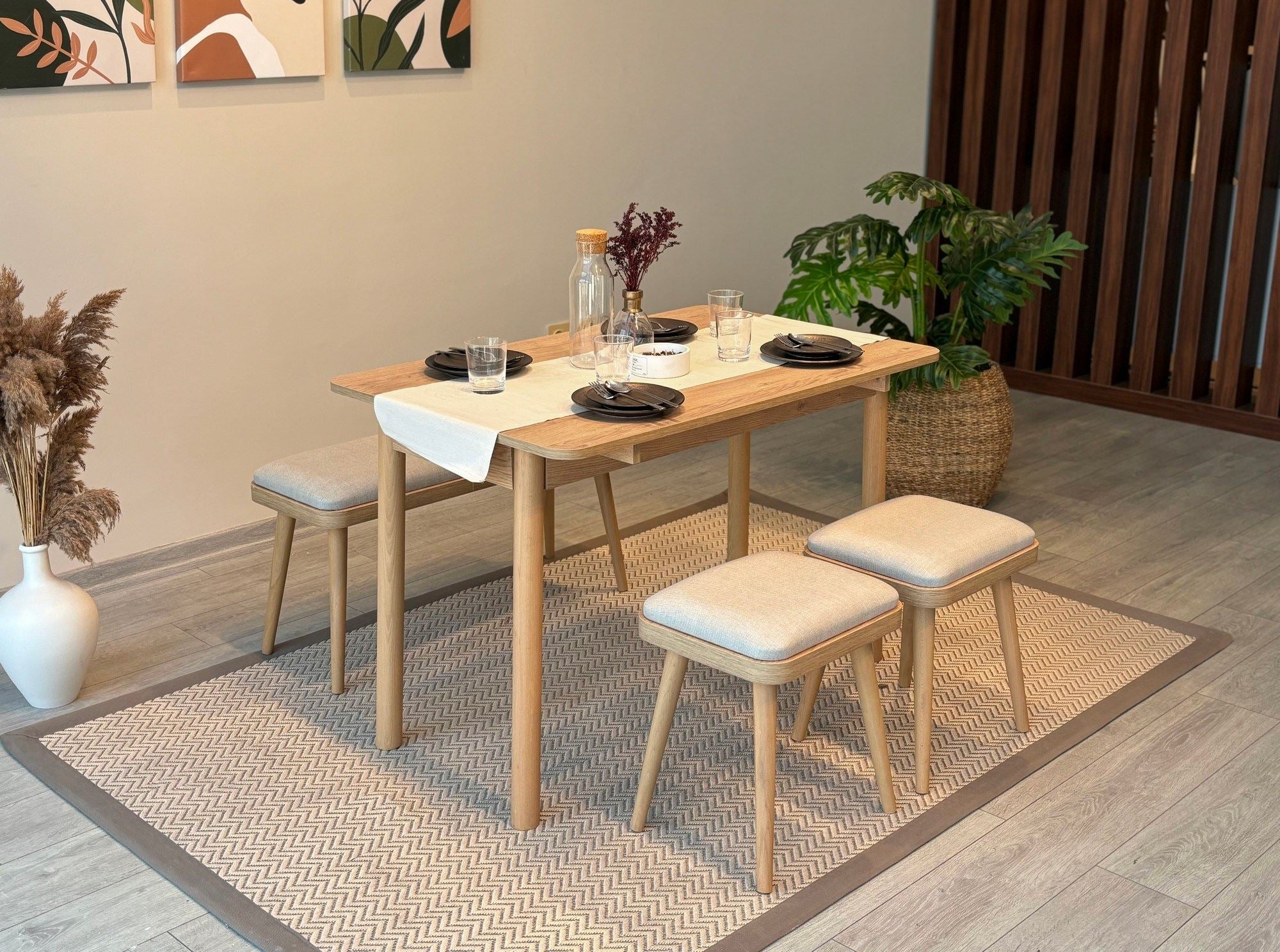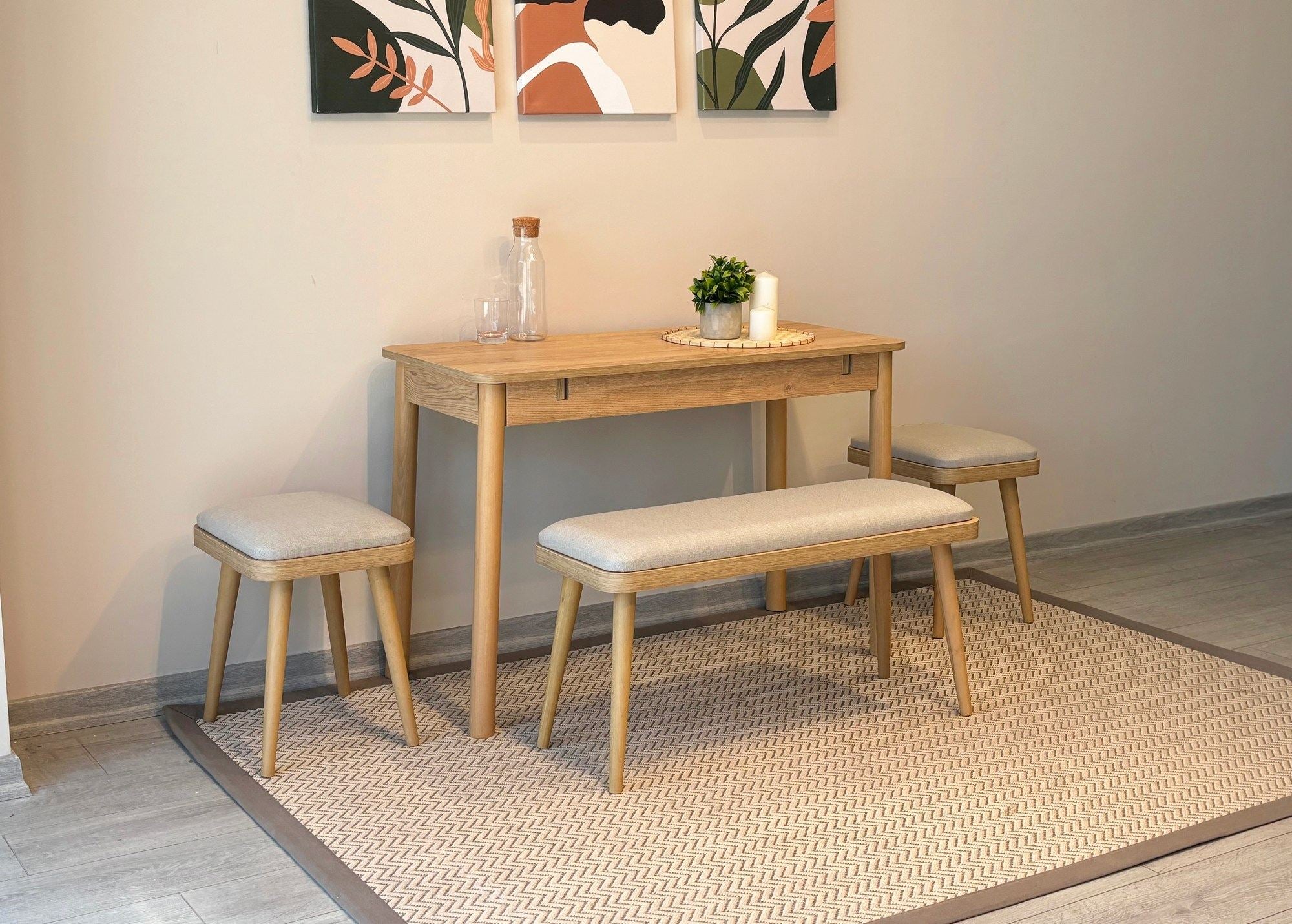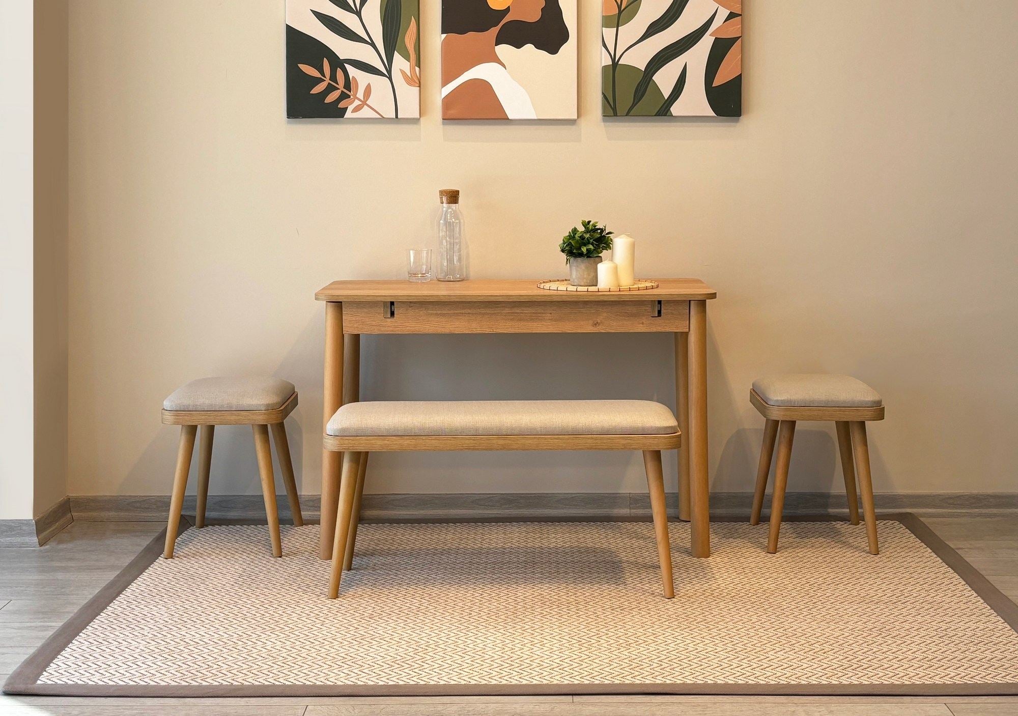 Az étkezőasztal 110 cm széles, 75 cm magas és 50 cm mély, így elegendő helyet biztosít az étkezésekhez. Kihúzva az asztal 70 cm mélységűre bővül, így több vendég kényelmesen elfér rajta. A készlet két széket és egy padot tartalmaz, mindegyiket az optimális kényelem és stílus érdekében tervezték.