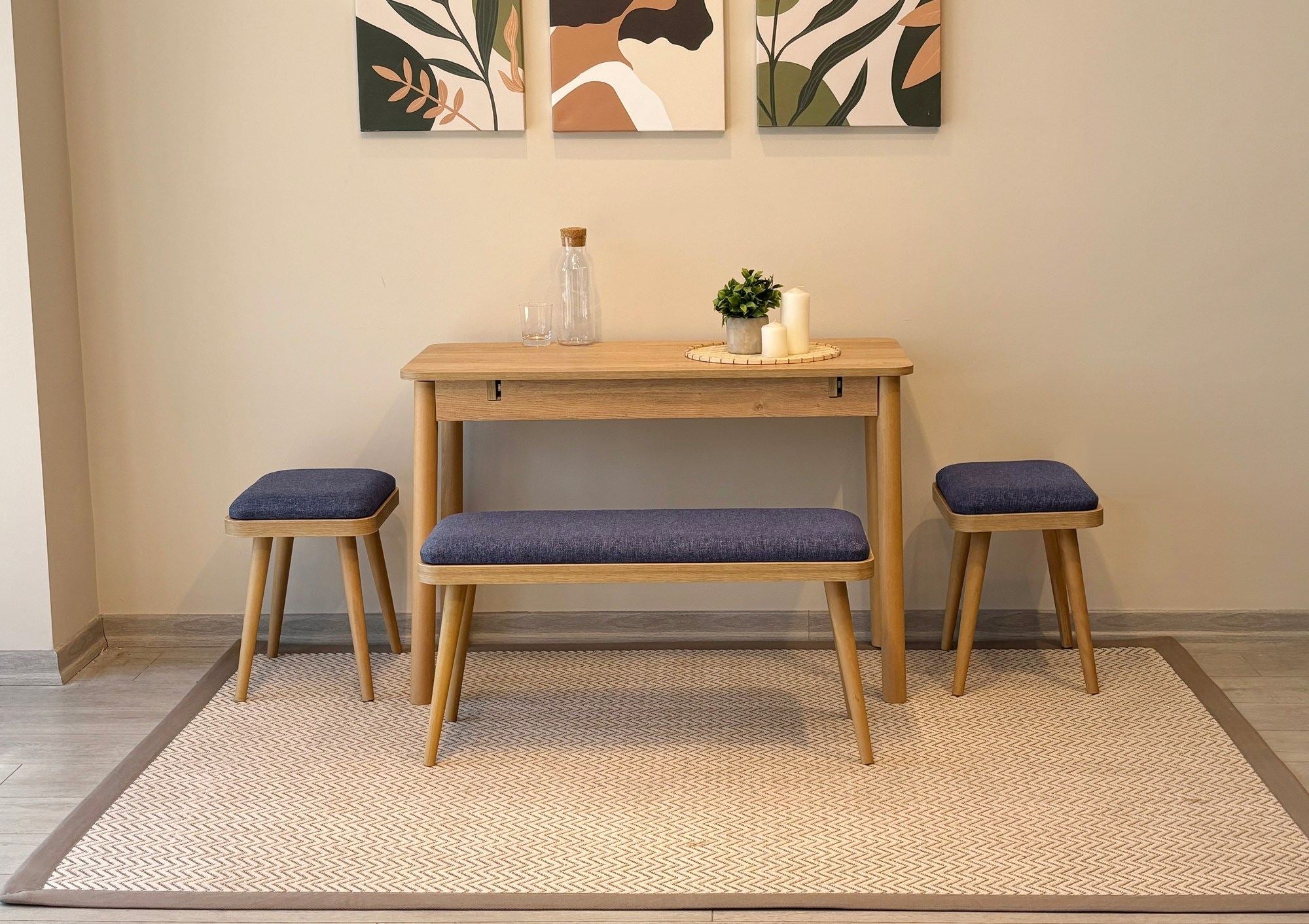A kihúzható étkezőasztal lehetővé teszi, hogy szükség esetén könnyedén befogadjon több vendéget, míg a zsámolyok és a pad kényelmes ülőhelyet biztosítanak mindenki számára. Akár vacsorapartit rendez, akár alkalmi étkezést élvez szeretteivel, ez a készlet mindenre kiterjed.