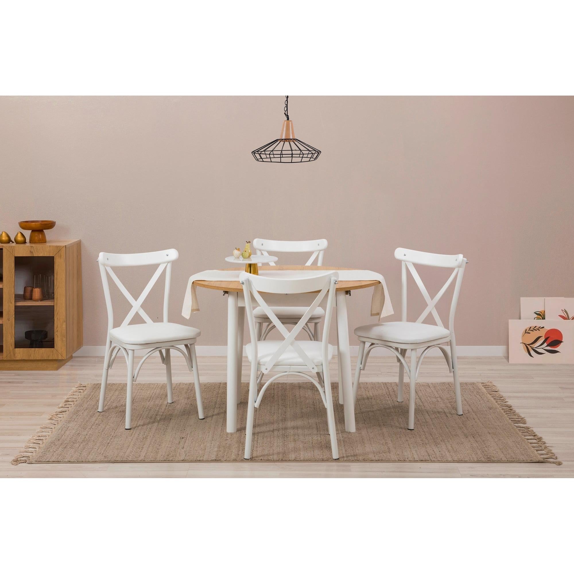 Kényelemben és kifinomultságban gyönyörködhet a székekkel. Ergonomikus kialakításukkal és plüss párnázottságukkal ezek a székek kivételes támasztást és kényelmet nyújtanak, lehetővé téve a hosszú beszélgetések és emlékezetes étkezések élvezetét. A fehér és a tölgy szín elegáns és időtlen kombinációja modern, mégis klasszikus jelleget kölcsönöz bármely belső térnek.