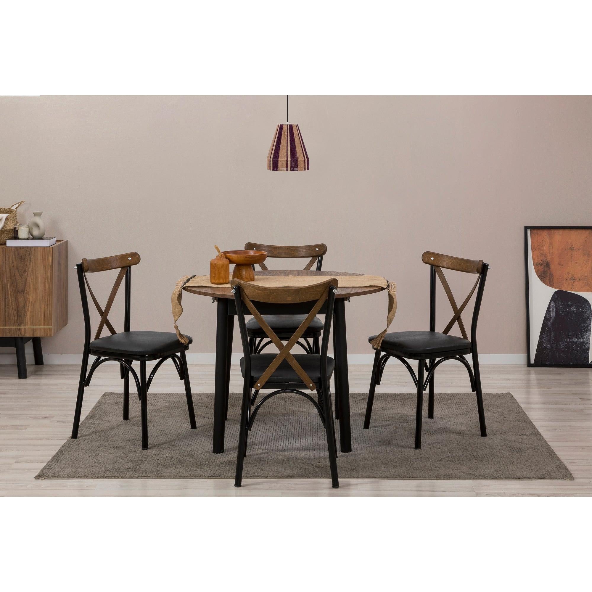 Teremtsen felejthetetlen emlékeket szeretteivel e lenyűgöző étkezőgarnitúra körül. A 100% melaminbevonatú forgácslapból készült készlet nemcsak tartós, de ellenáll a karcolásoknak, foltoknak és a hőnek is. A karcsú fekete és diófa színek eleganciát és kifinomultságot kölcsönöznek bármely helyiségnek.
