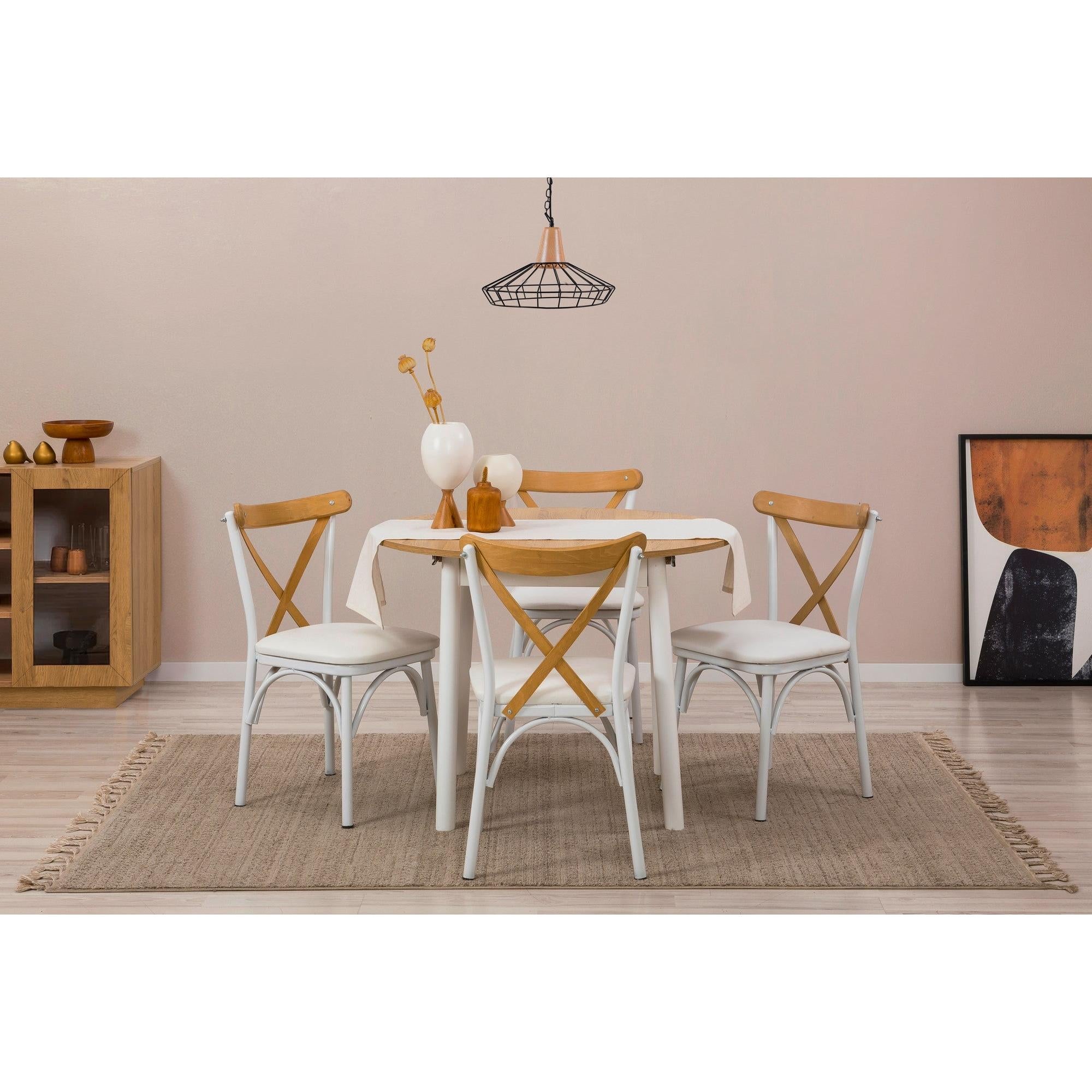Tapasztalja meg a stílus és a funkcionalitás tökéletes ötvözetét ezzel a lenyűgöző, 5 darabos készlettel. A 100% melaminbevonatú forgácslapból készült étkezőgarnitúra tartósan készült, így hosszú éveken át élvezheti az asztal körüli szórakozást és az emlékeket.