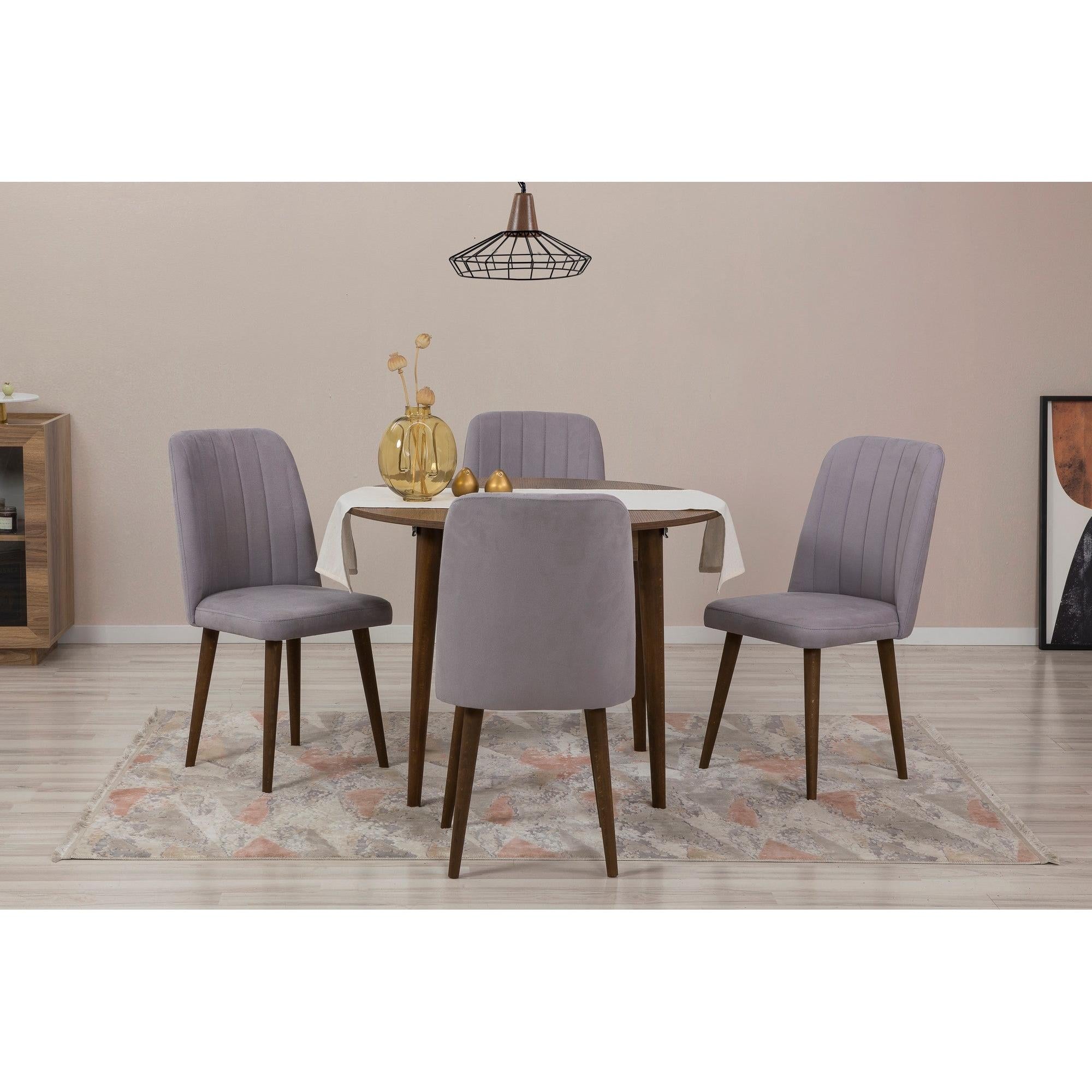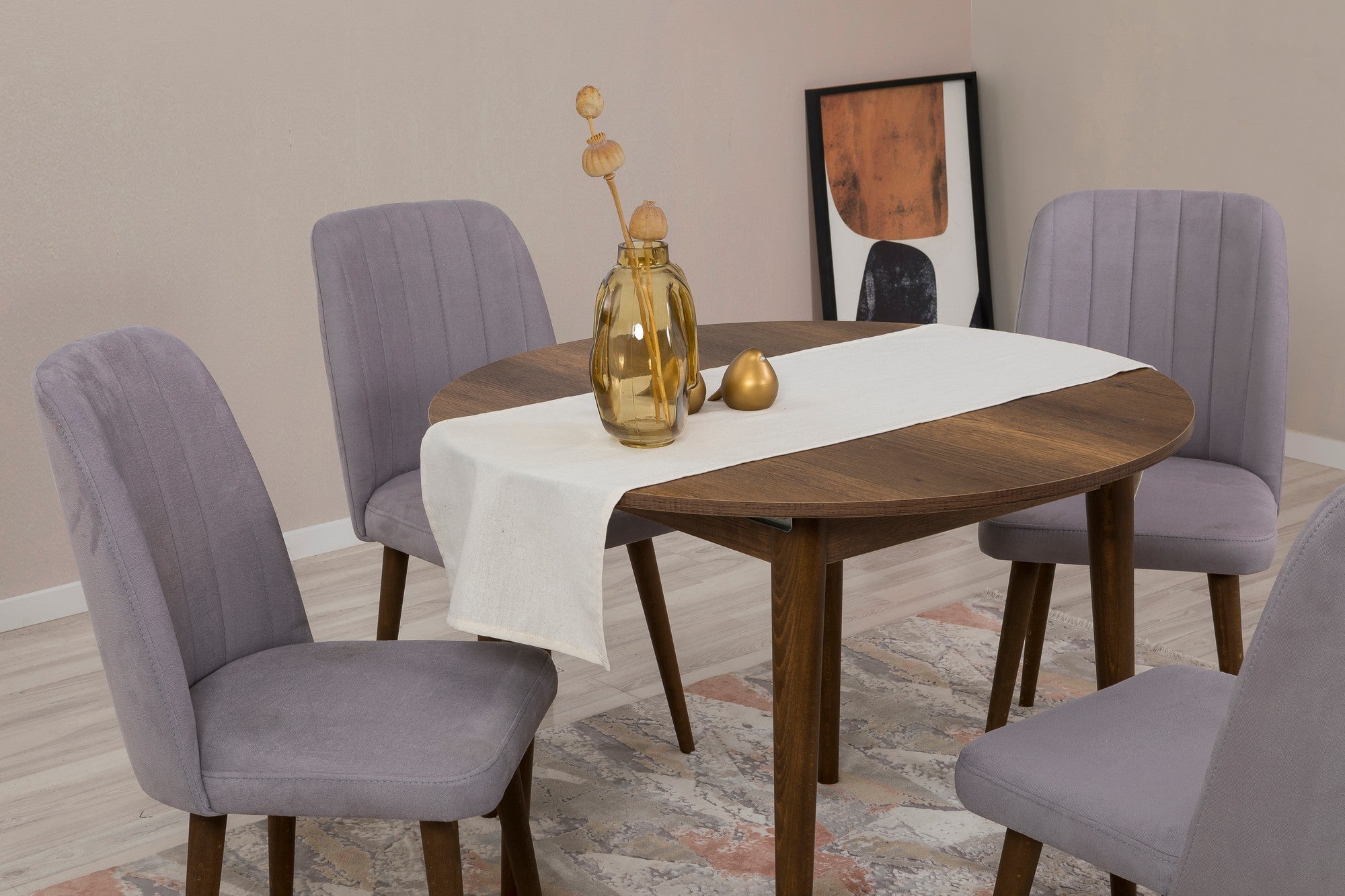 Tapasztalja meg a modern és hagyományos elemek tökéletes keveredését. A falábak melegséget és kifinomultságot kölcsönöznek, míg a dió és a szürke színkombináció könnyedén kiegészít bármilyen belsőépítészeti dekorációt. Ez a szett egy igazi statement darab, amely lenyűgözi vendégeit, és hangulatos légkört teremt a felejthetetlen összejövetelekhez.