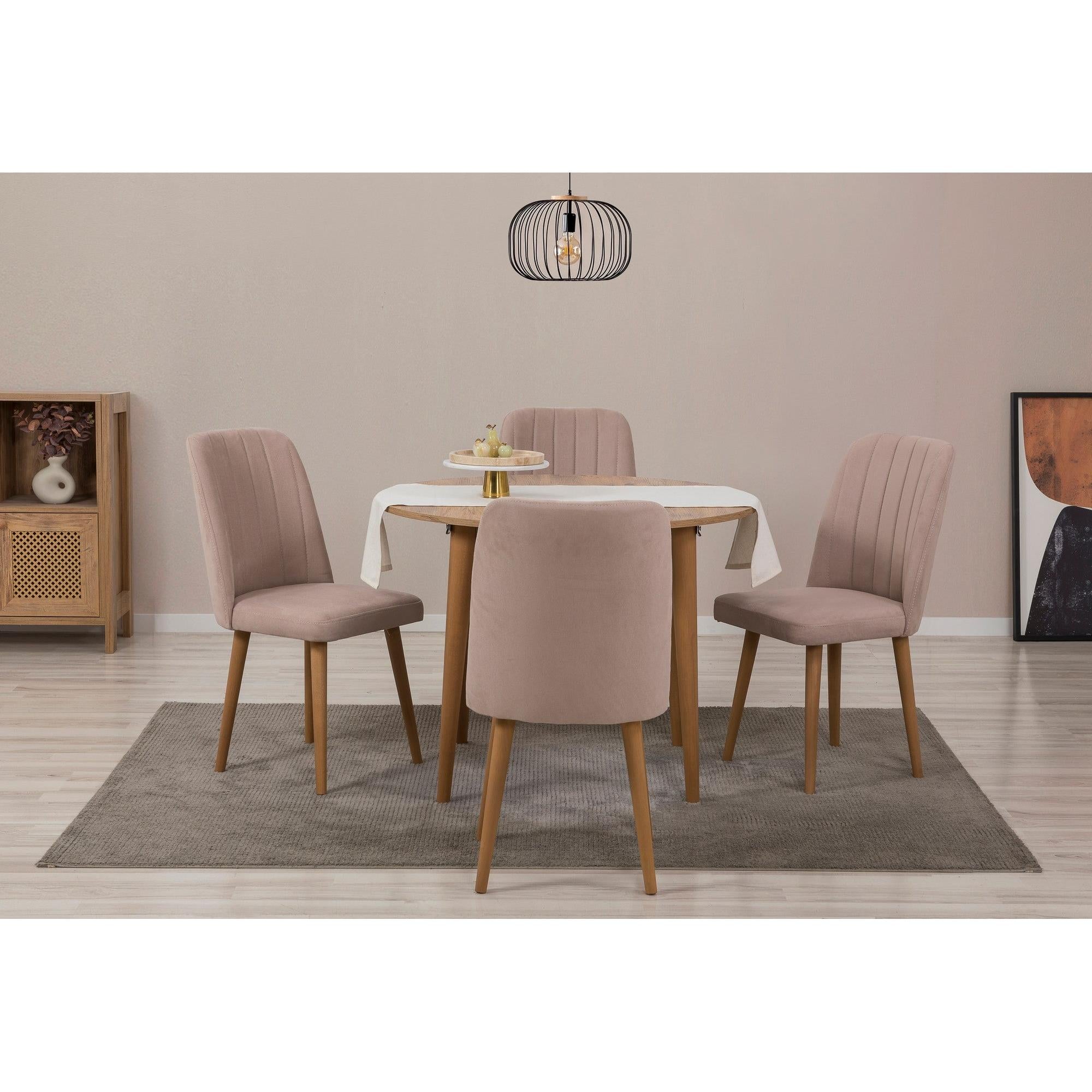A 100% melaminbevonatú forgácslapból készült étkezőgarnitúra kivételes tartóssággal és hosszú élettartammal büszkélkedhet. A 18 mm-es vastagság masszív konstrukciót biztosít, amely kiállja az idő próbáját. A falábak eleganciát kölcsönöznek, így tökéletes kiegészítője lehet bármilyen modern vagy hagyományos dekorációnak.
