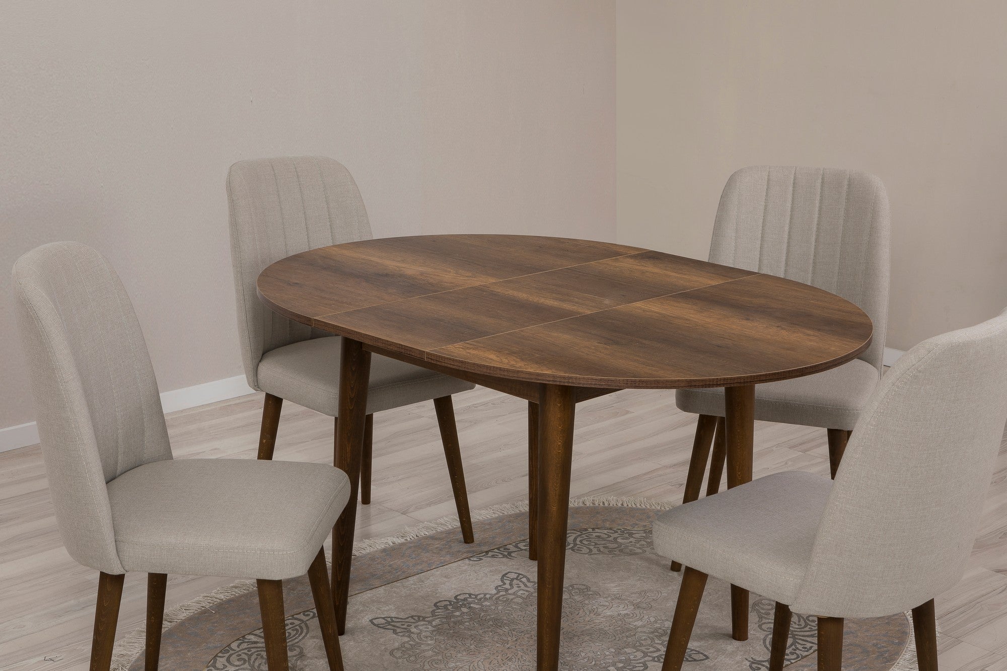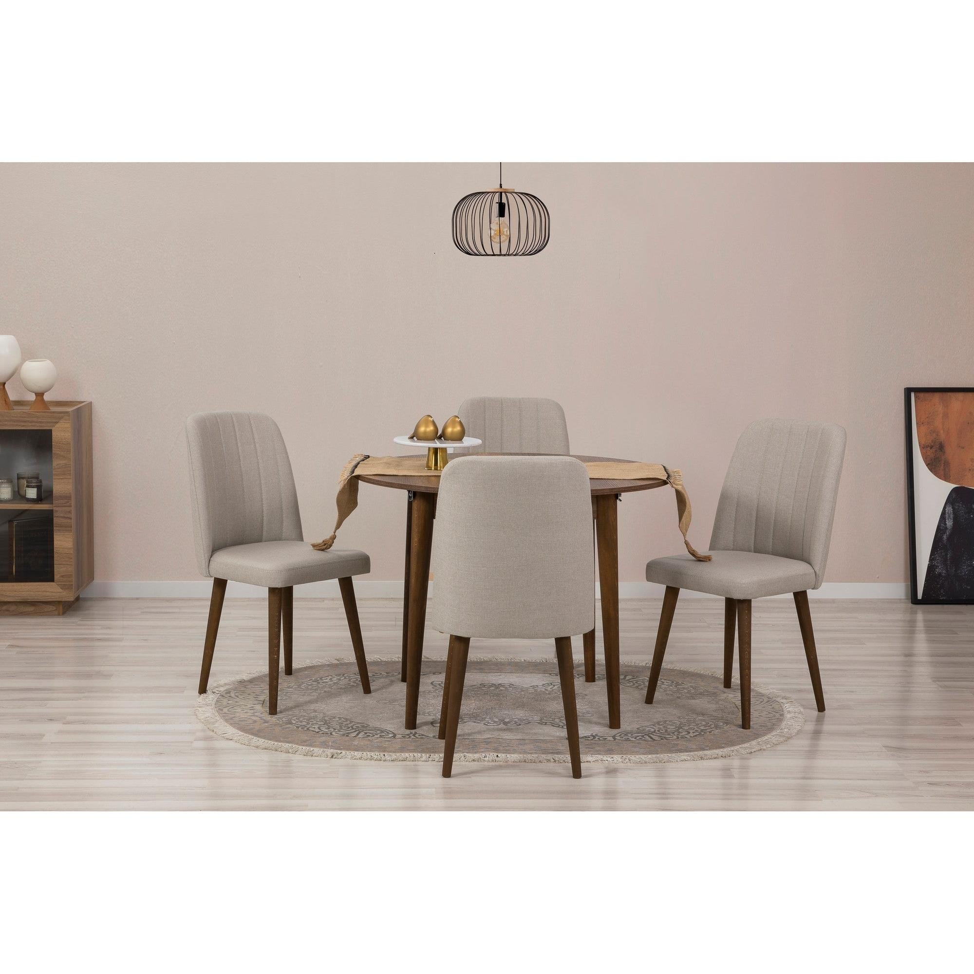 A diófa és krémszínű színek lenyűgöző kombinációjával ez az étkezőgarnitúra kifinomultságot kölcsönöz minden térnek. A falábak természetes elemet adnak hozzá, fokozva az általános esztétikai vonzerőt. Akár modern, akár hagyományos dekorációval rendelkezik, ez a garnitúra zökkenőmentesen illeszkedik, emelve étkezője stílusát.