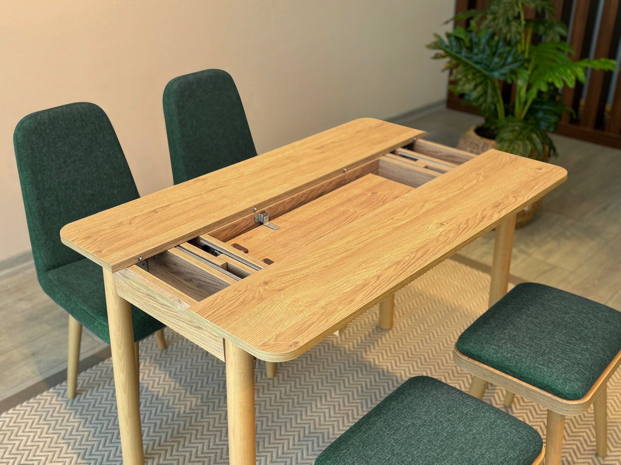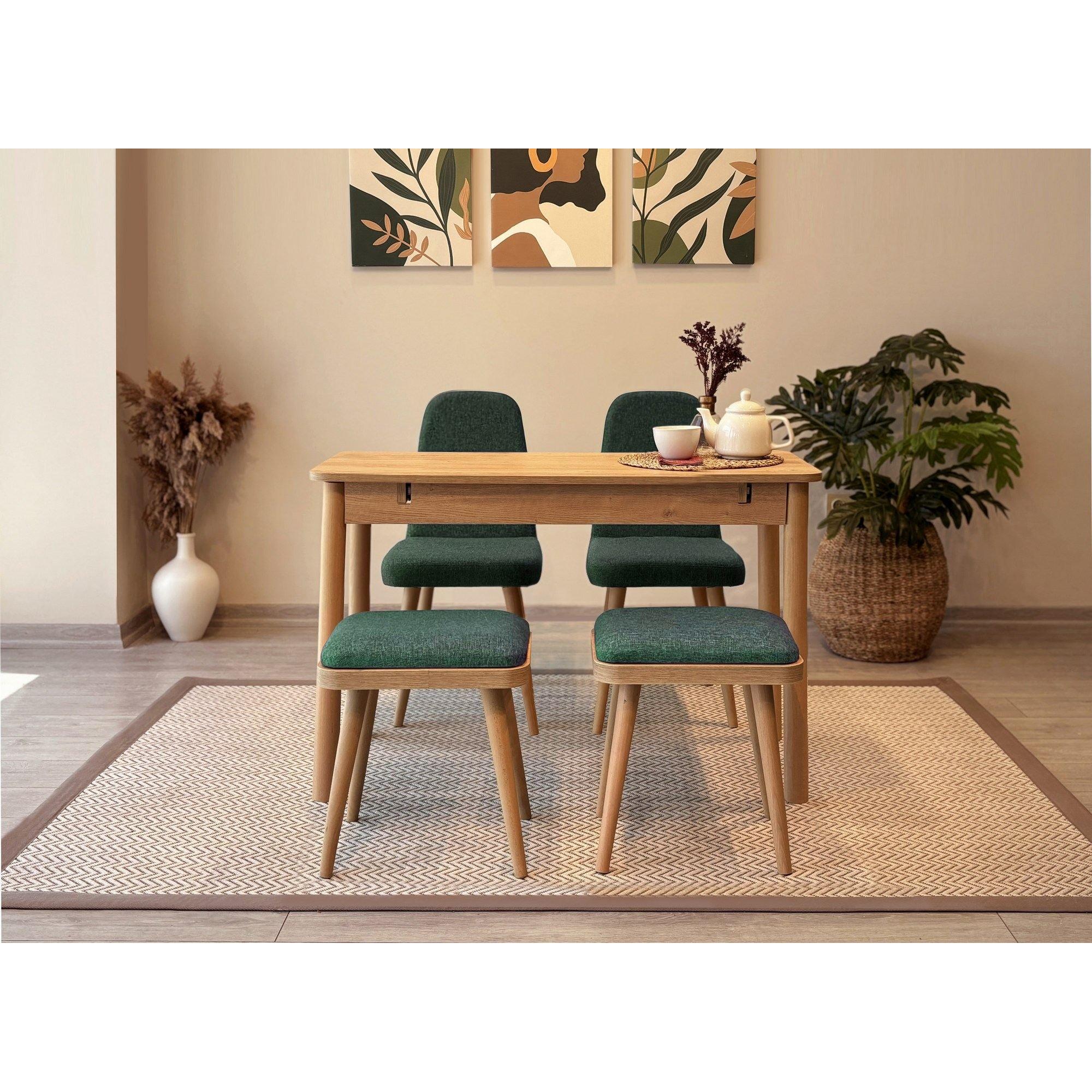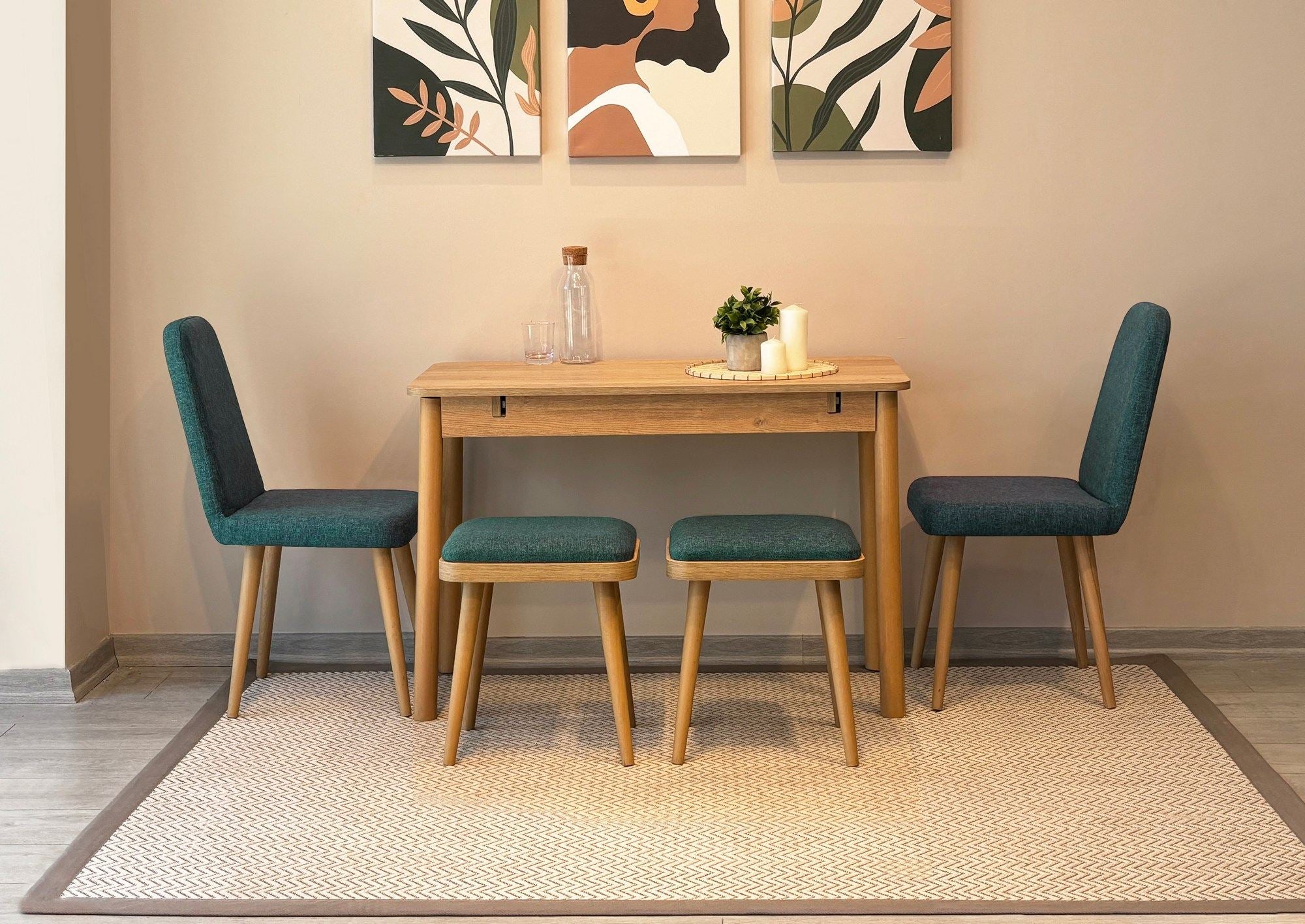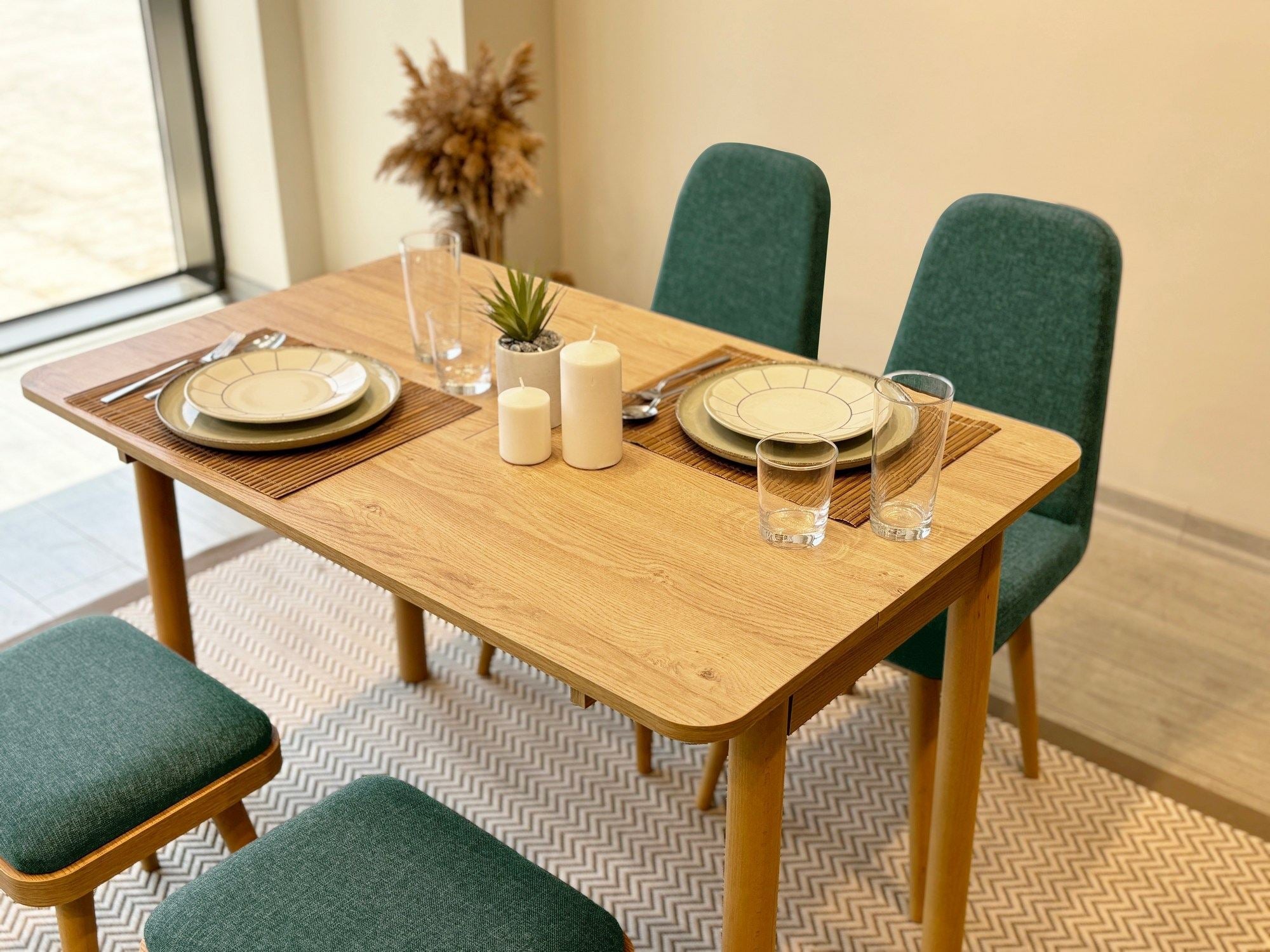 Ennek az étkezőszettnek a letisztult és modern dizájnja emeli az étkezője megjelenését, barátságos légkört teremtve családja és vendégei számára. A tölgy és zöld színkombináció egy csipetnyi kifinomultságot ad bármilyen dekorációs stílushoz.