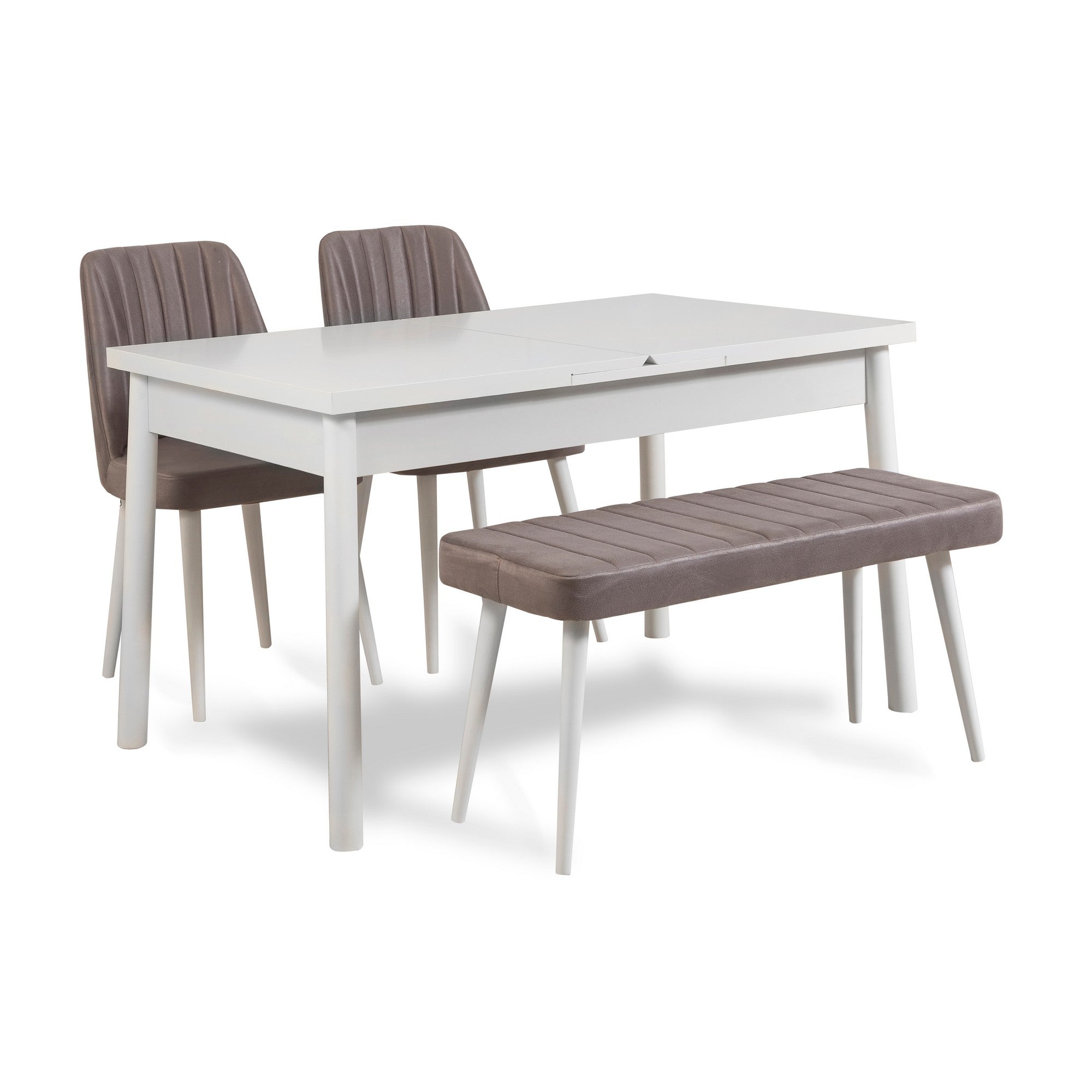 Alakítsa át étkezőjét egy kényelmes és stílusos hellyé az Extendable Dining Table & Chairs Set segítségével. 100%-ban melamin bevonatú forgácslapból és fa lábakból készült, ez a szett a minőséget és tartósságot sugározza. A letisztult dizájn és a semleges fehér és szürke színpaletta tökéletes kiegészítője bármely modern otthonnak.