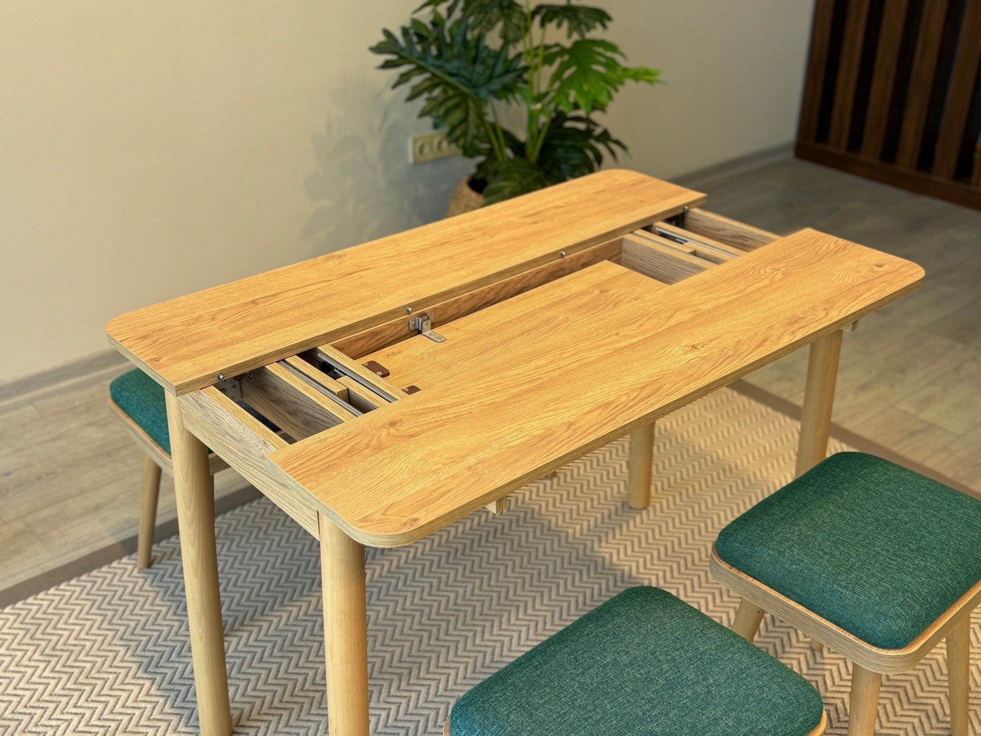 A 100% melaminbevonatú forgácslapból készült étkezőgarnitúra nemcsak elegáns, hanem tartós is, így hosszú éveken át tart. Az elegáns tölgy és zöld színkombináció modern kifinomultságot kölcsönöz bármely étkezőnek.