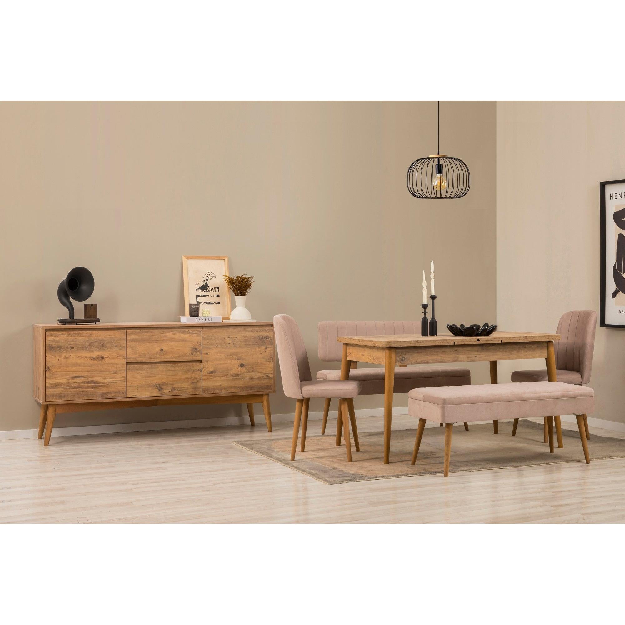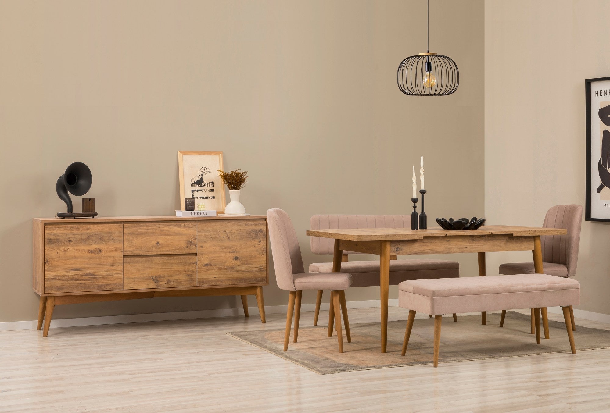 Az étkezőasztal letisztult dizájnnal rendelkezik, 18 mm vastagságú, tökéletes családi vacsorák vagy baráti összejövetelek lebonyolításához. Kinyitva az asztal elegendő helyet biztosít mindenki számára, hogy együtt élvezhessék az étkezést. A székek a kényelem érdekében lettek tervezve, 40 cm ülésmagassággal és 43,5 cm ülésmélységgel, biztosítva, hogy vendégei kényelmesen pihenhessenek és élvezhessék az időt az asztalnál. A konzol luxus érintést ad a szettnek, tágas dizájnjával és elegáns Atlanti fenyő és kő színkombinációjával.