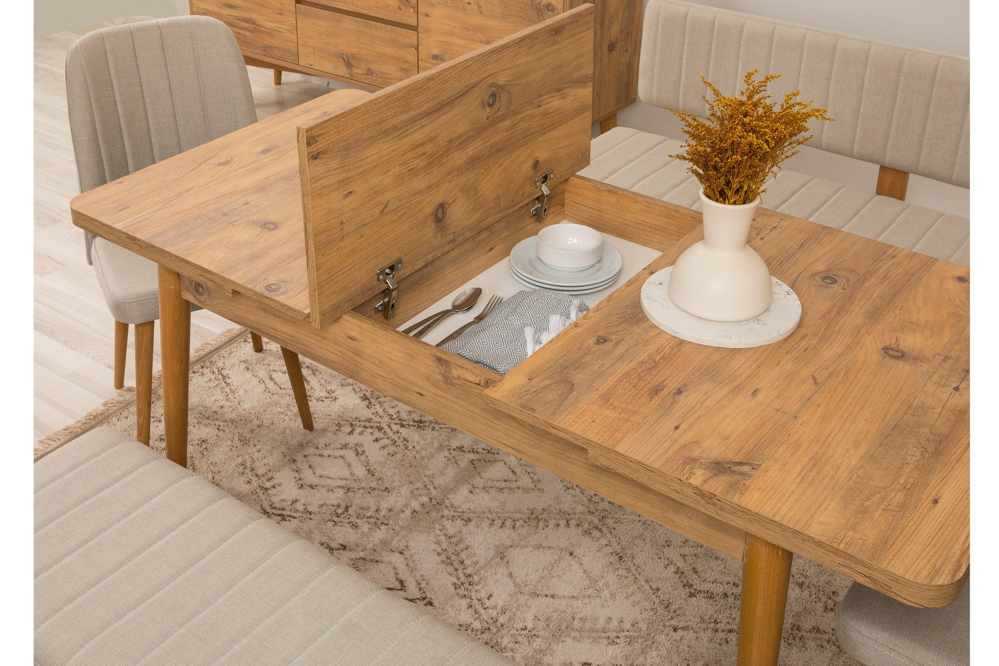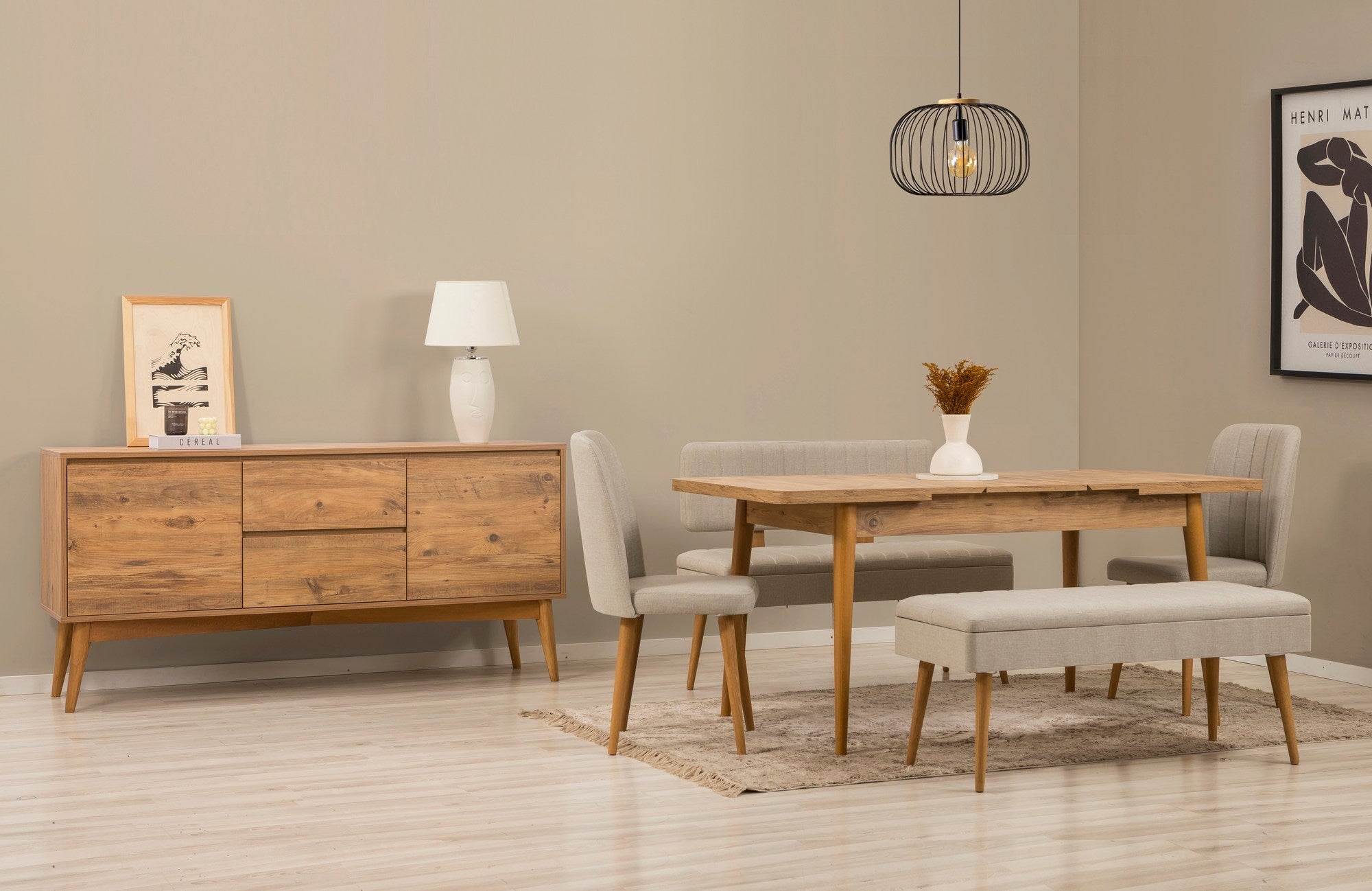 Az Atlanti fenyő és krém színkombináció egy csipetnyi kifinomultságot ad bármely étkezőhöz, míg a kihúzható étkezőasztal lehetővé teszi, hogy könnyedén több vendéget fogadjon. A székek a stílus és kényelem jegyében készültek, így minden étkezés egy luxus élmény lesz. A konzol és a pad kiegészíti a készletet, elegendő tárolási és ülőhelyet biztosítva családja és vendégei számára.