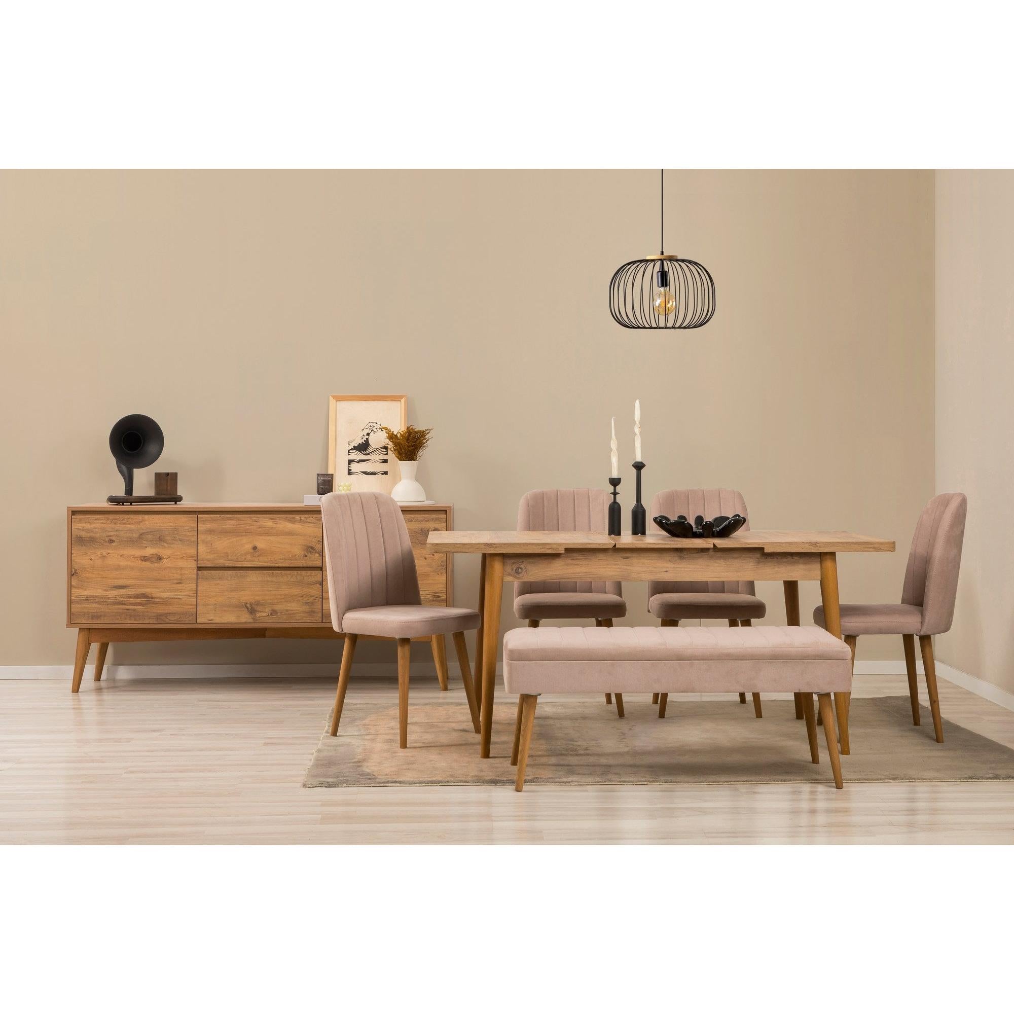 Változatos funkcionalitás : a kihúzható étkezőasztal lehetővé teszi, hogy szükség esetén könnyedén több vendéget fogadhasson, míg a konzol extra tárolóhelyet biztosít az étkezéshez szükséges tárgyak számára. A székek kényelmesek és stabilak, tökéletesek a hosszú órákon át tartó étkezéshez és beszélgetéshez.