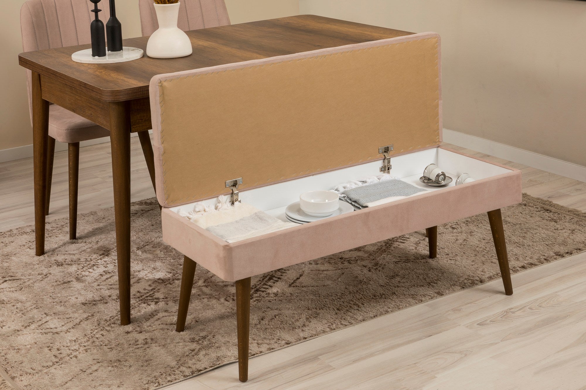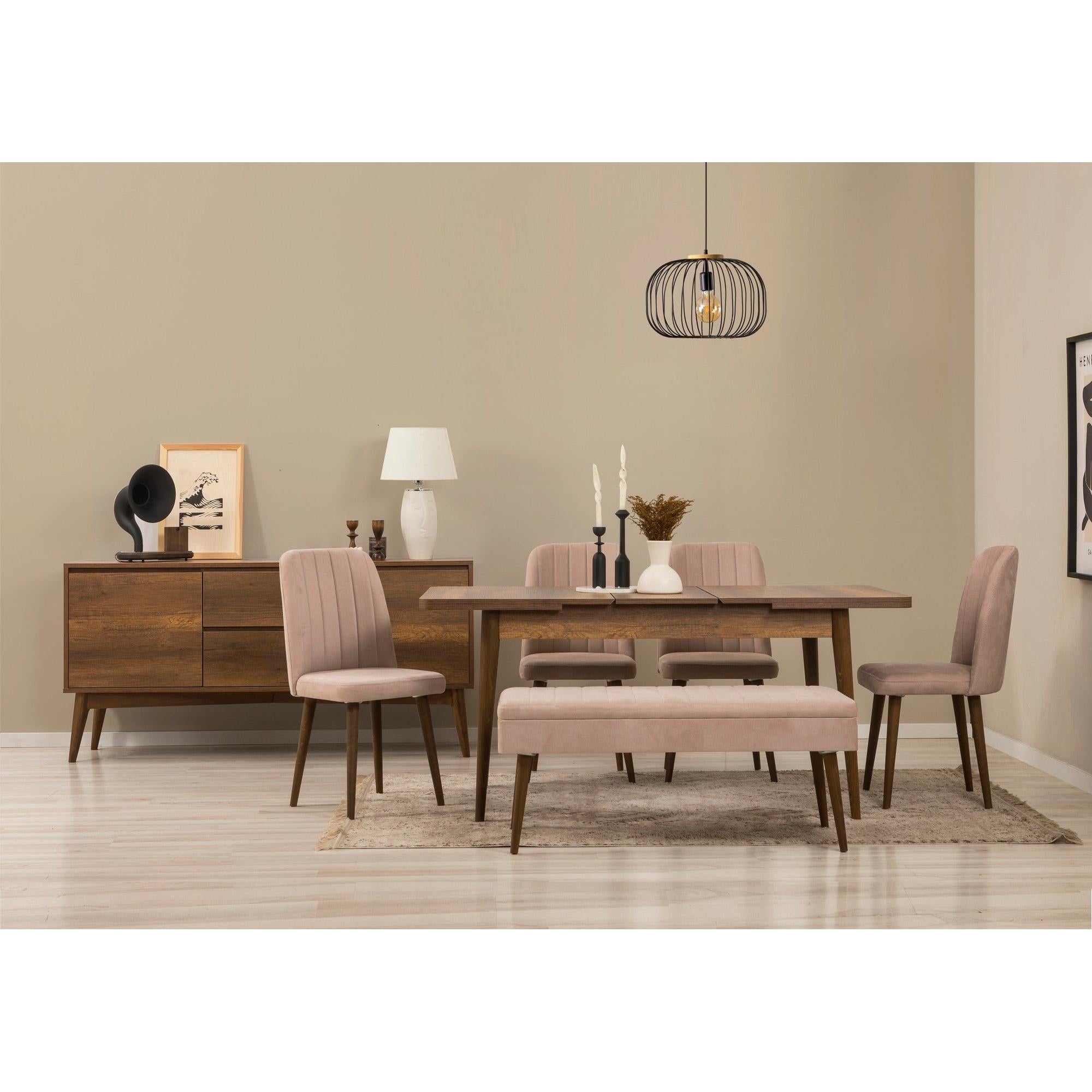 Az étkezőasztal letisztult dizájnnal rendelkezik, diófából készült, míg a székek luxus kőszínű kárpitozással készültek. A konzol egy kis eleganciát ad a szobának, a pad pedig extra ülőhelyet biztosít a vendégek számára.