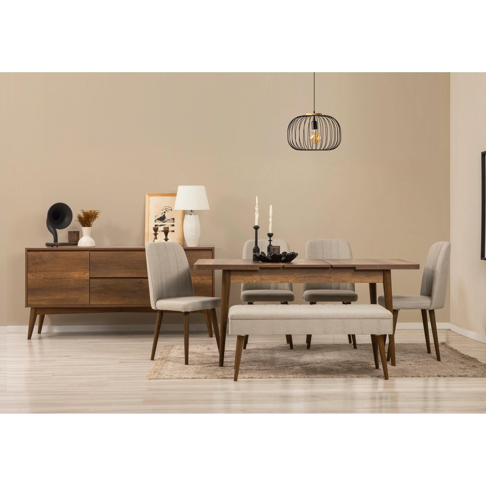 Az étkezőasztal sima diófából készült, krém színű kiegészítőkkel, ami kifinomult megjelenést kölcsönöz, amely fokozza bármilyen étkező dekorációt. A székek a kényelem és a stílus jegyében készültek, modern sziluettel és puha párnázott ülésekkel. A konzol egy csipetnyi fényűzést ad hozzá tágas dizájnjával és letisztult vonalaival, tökéletes a kedvenc dekorációs elemeinek bemutatására.