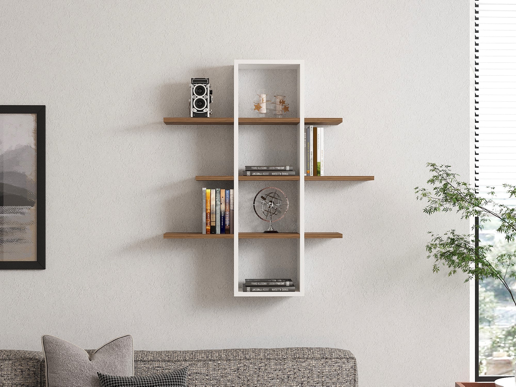Meleg diófa és fehér színkombinációjával ez a fali polc könnyedén kifinomultságot kölcsönöz bármely helyiségnek. Akár kedvenc könyveit szeretné megjeleníteni, akár dekorációs tárgyakat szeretne bemutatni, vagy a legszükségesebb dolgokat rendszerezni, ez a polc tökéletes platformot biztosít ahhoz, hogy meleg és hívogató légkört teremtsen otthonában.
