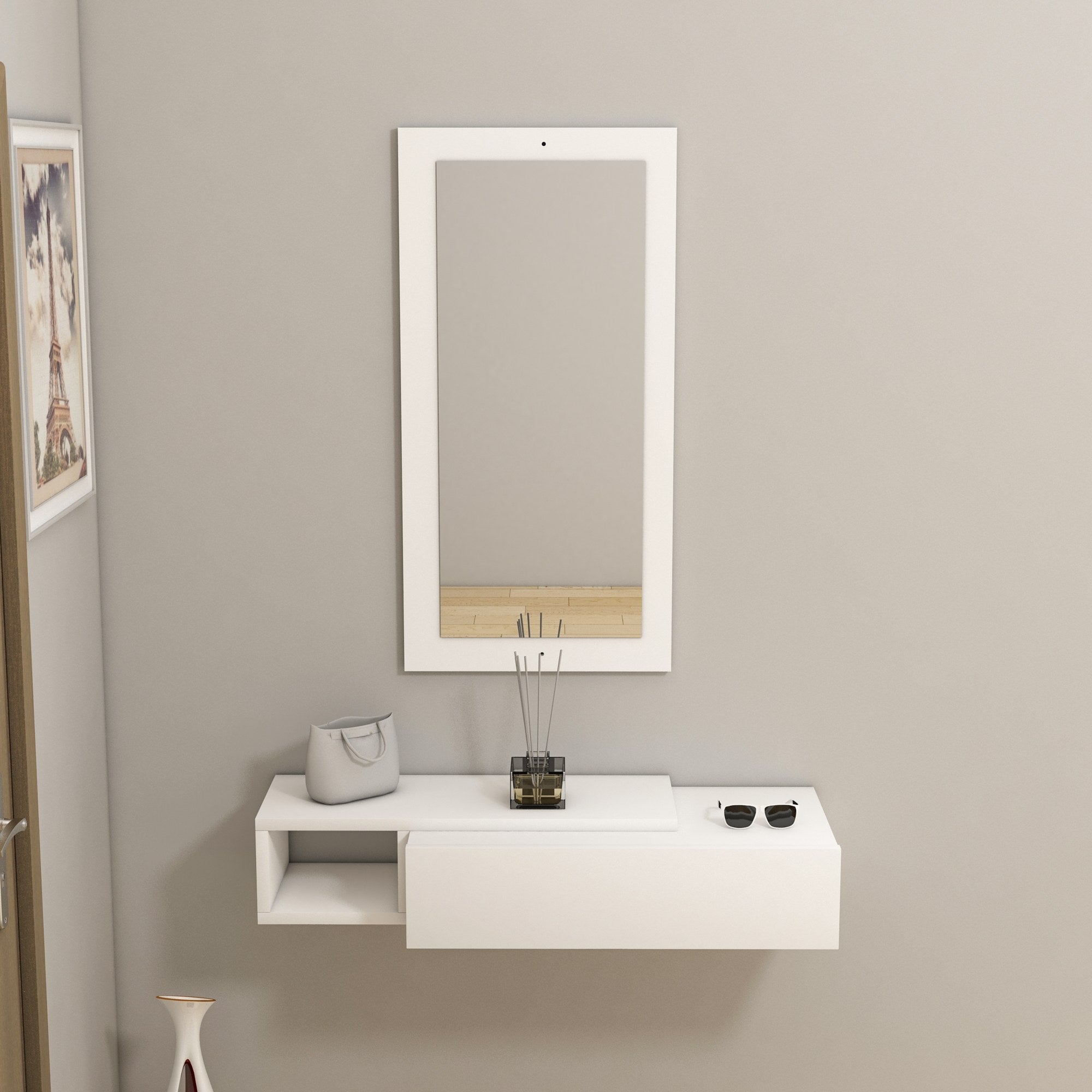 Ez a komód a falra rögzíthető, így értékes helyet takaríthat meg a padlón, és rendetlenségmentes környezetet teremthet. Karcsú és kompakt kialakításának köszönhetően bármilyen helyiségbe illik, legyen az a nappali, az étkező vagy az előszoba. A fehér szín eleganciát kölcsönöz, és zökkenőmentesen illeszkedik bármilyen dekorációs stílushoz.