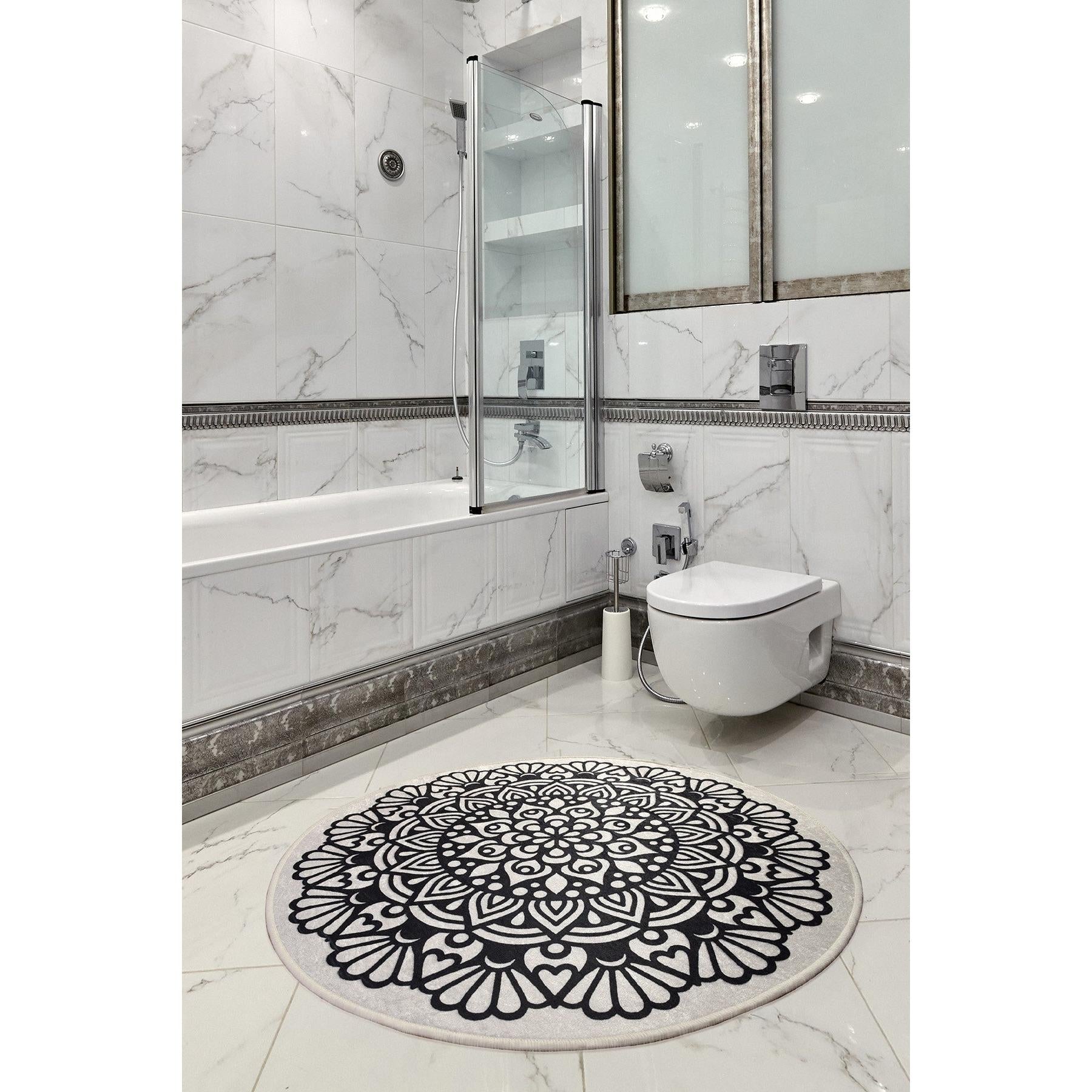 A 100 cm átmérőjű fürdőszőnyegünk tökéletes méret, amely bármilyen fürdőszobai dekorációhoz illeszkedik. Lenyűgöző digitális nyomtatása eleganciát és kifinomultságot kölcsönöz a helyiségnek, így igazi statement-darab lesz.