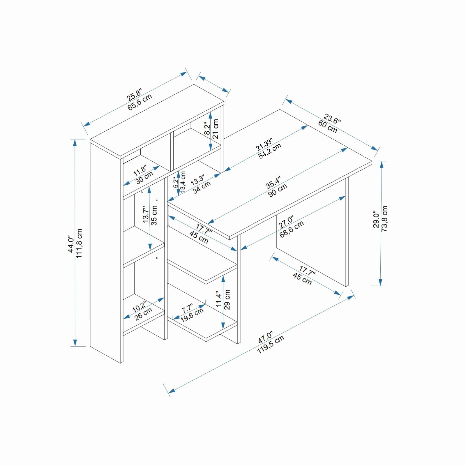 A nagyvonalú, 70 cm-es íróasztal méretével. 5 cm szélességű, 73 cm-es méretével. 8cm magasságával és 60cm mélységével tanulóasztalunk bőséges helyet biztosít könyvei, laptopja és egyéb tananyagai számára. A felső polc, amelynek mérete 65. 4cm szélességű, 111. 8cm magasságú és 19. 5cm mélységű, további tárolóhelyet kínál kedvenc könyvei vagy dekorációs tárgyai számára.