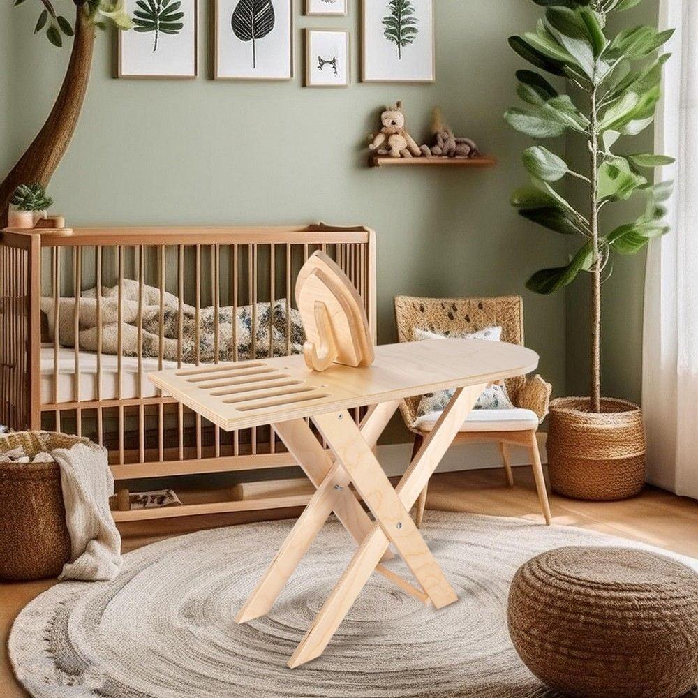 A Vasaló és Vasalódeszka szett gyönyörű tölgy színben pompázik, eleganciát adva gyermeked játékterének. A semleges színpaletta zökkenőmentesen illeszkedik bármilyen dekorációhoz, így stílusos kiegészítője lehet otthonodnak.