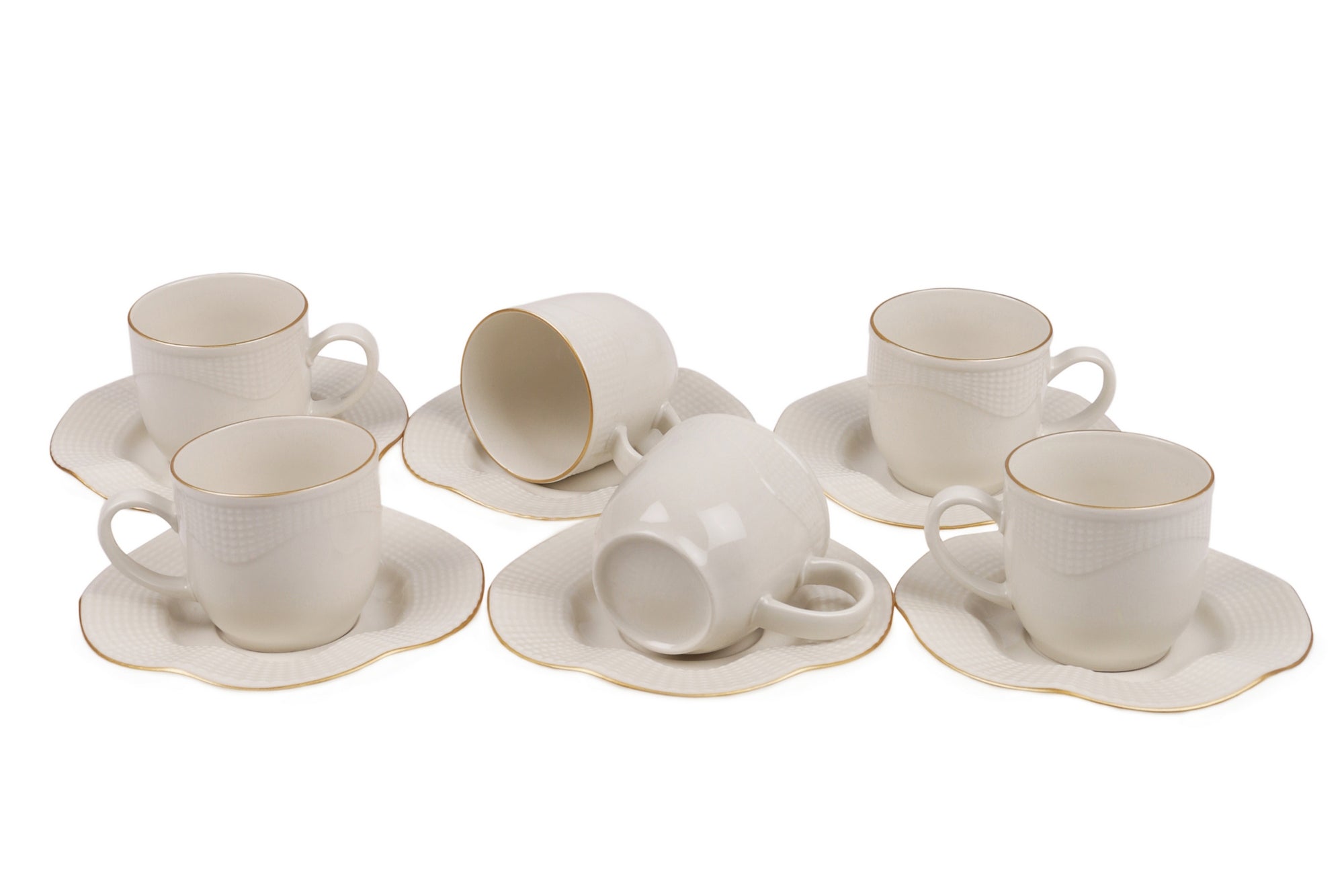 Ennek a kávéscsésze készletnek a krém és arany színkombinációja egy csipetnyi opulenciát kölcsönöz az asztalterítésnek. A gazdag arany ékezetek gyönyörűen kiegészítik a krémszínű alapot, olyan vizuális remekművet alkotva, amely biztosan lenyűgözi vendégeit. Emelje fel a kávéivás élményét ezzel a lenyűgöző készlettel.