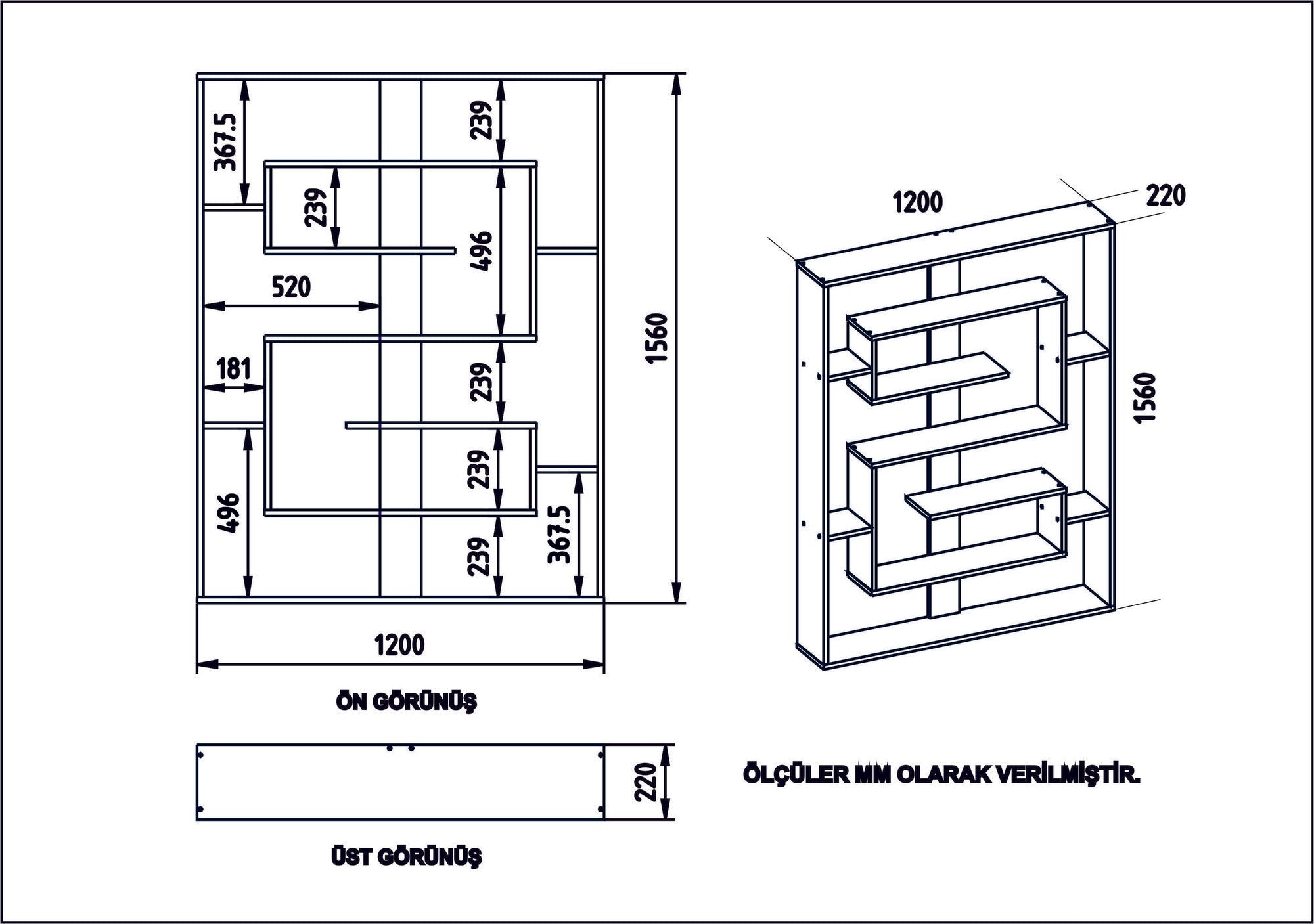 - Könyvespolc mérete: 1 db: Szélesség: 120 cm, Magasság: 156 cm, Mélység: 22 cm.