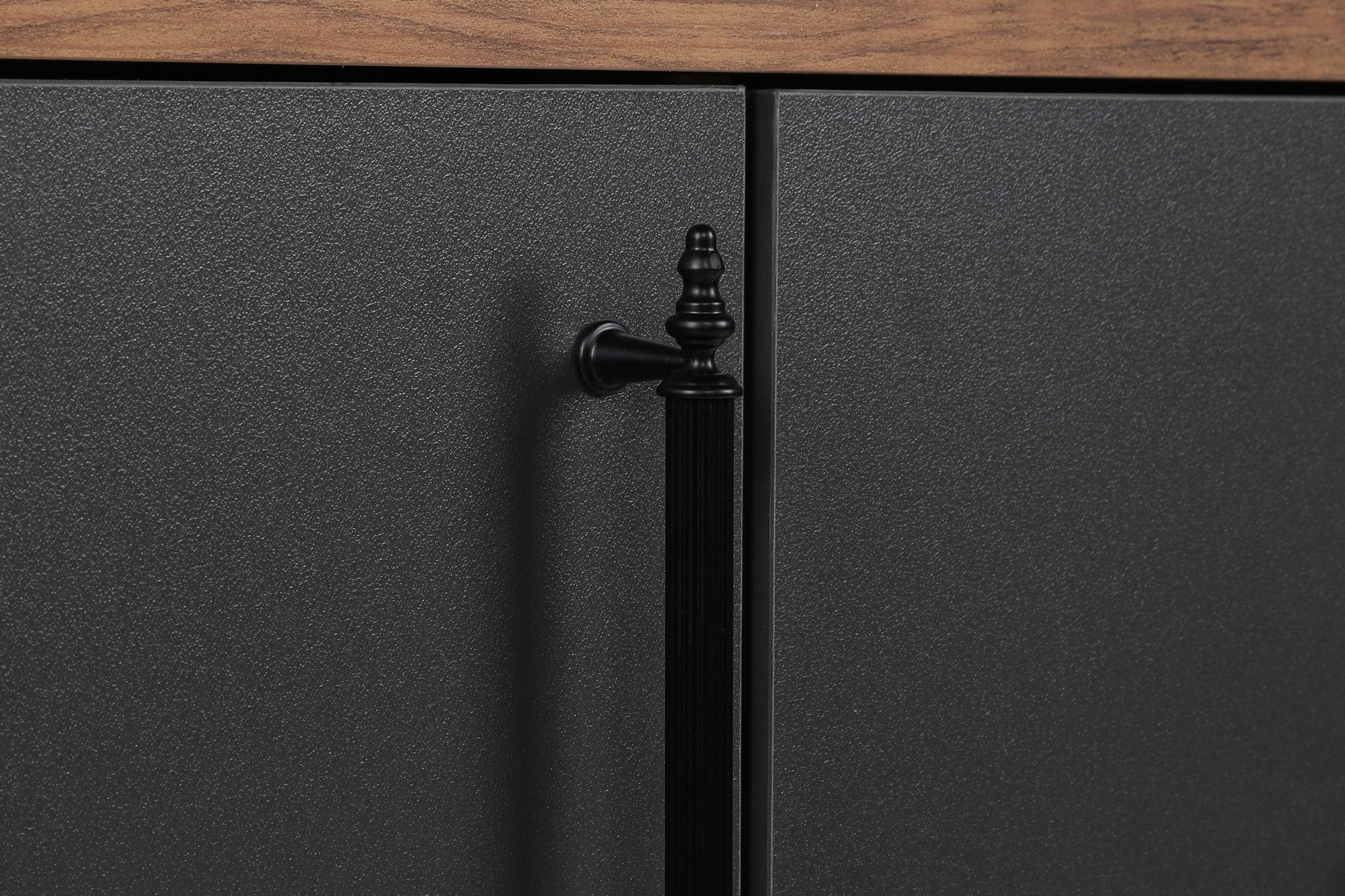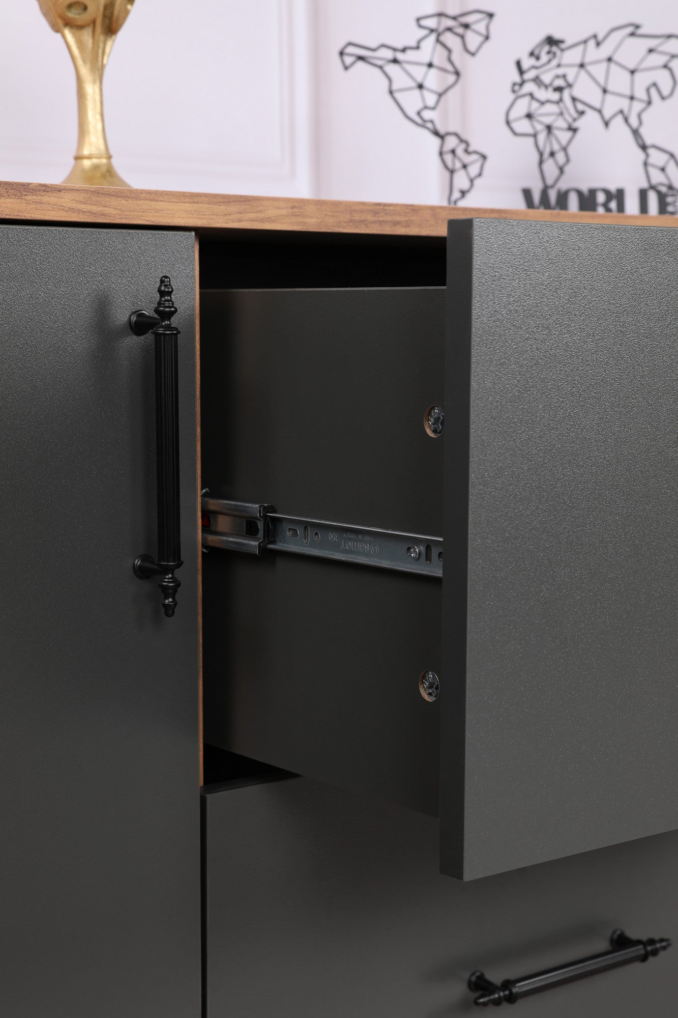 Elegáns kialakításával és dió és antracit színkombinációjával konzolunk modernitást kölcsönöz bármely helyiségnek. A falábak stabilitást és természetes elemet biztosítanak, míg a teleszkópos fiókcsúszdák sima és könnyed nyitást és zárást biztosítanak.