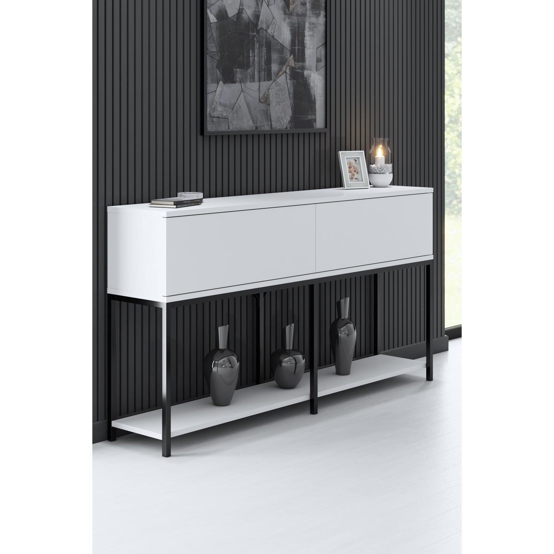 Tapasztalja meg a meggyőzés erejét, miközben felfedezi a konzol által kínált végtelen lehetőségeket. Akár stílusos tárolási megoldásra van szüksége a nappalijába, akár elegáns bemutatóállványra kedvenc dekorációs darabjainak, vagy funkcionális munkaterületre az otthoni irodájába, ez a konzol minden igényt kielégít. Tágas 150 cm-es szélessége, 80 cm-es magassága és 30 cm-es mélysége bőséges tároló- és bemutatóhelyet biztosít, így könnyedén rendszerezheti holmiját.