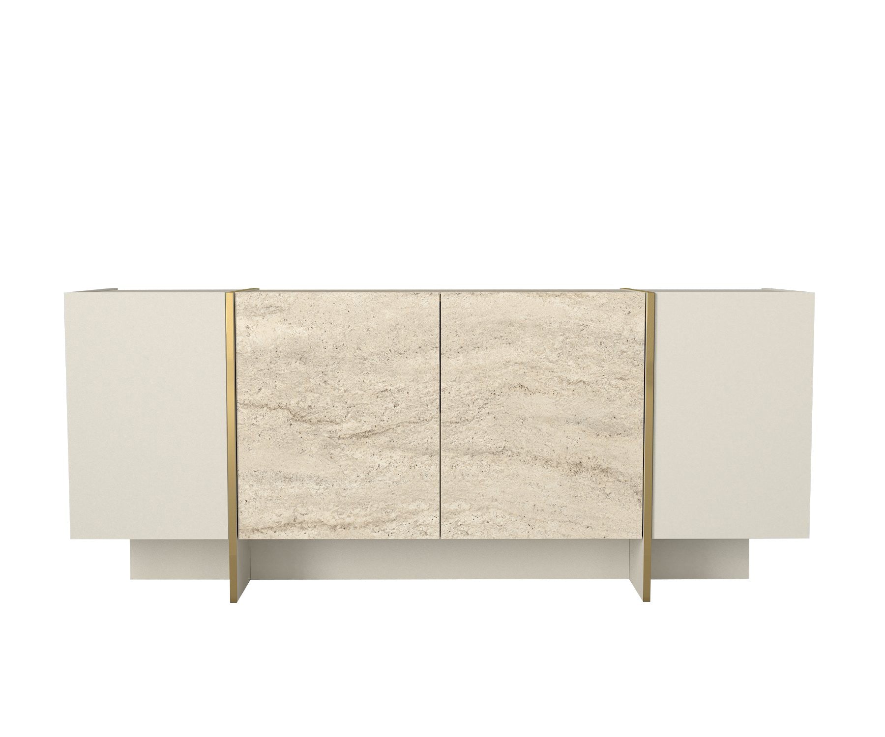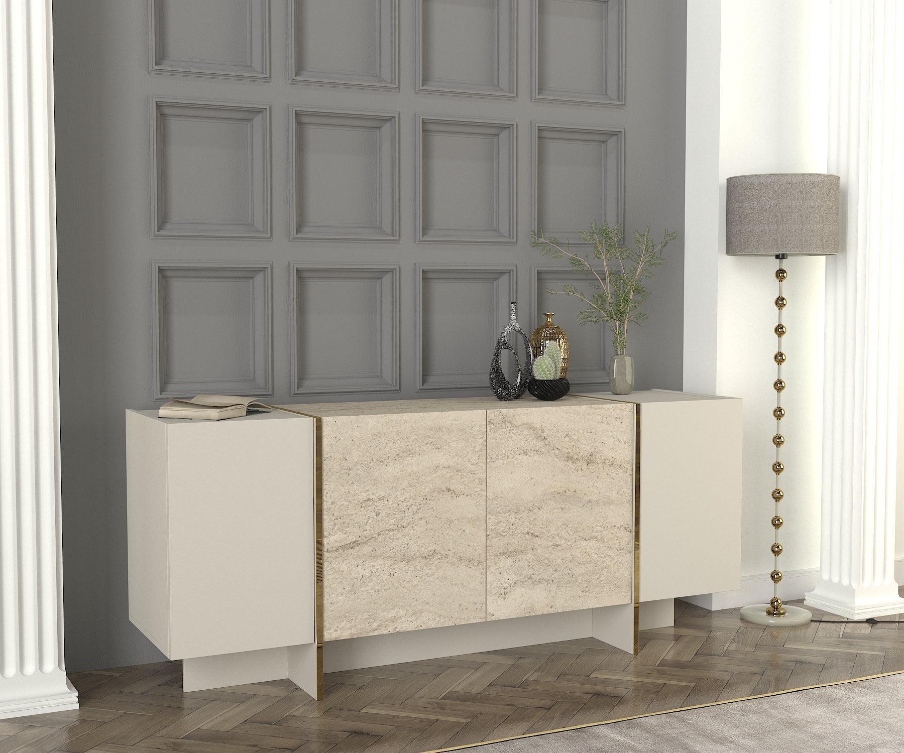 A konzol karcsú és modern kialakítású, a travertin és a homokkő színek kombinációjával, amelyek kifinomultak és stílusúak. A tábla 18 mm -es vastagsága biztosítja a tartósságot és a hosszú élettartamot, így időtlen kiegészítést jelent az otthoni dekorációhoz.