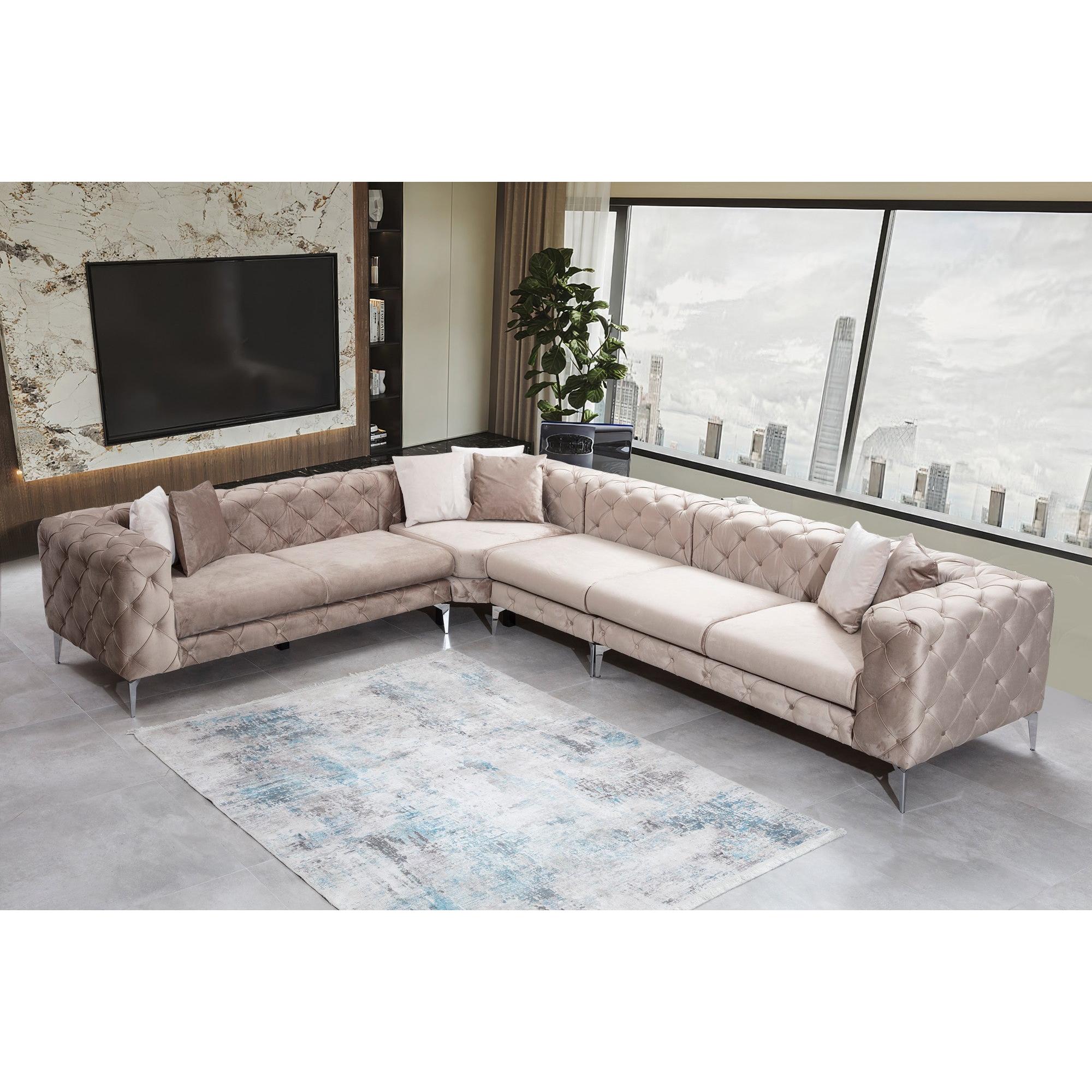 Adjon otthonának egy csipetnyi kifinomultságot sarokkanapéinkkal. Egyszínű, bézs színű ülőgarnitúrája eleganciát és sokoldalúságot sugároz, így tökéletesen illeszkedik bármilyen lakberendezési stílushoz. A modern és újszerű dizájn kortárs hangulatot kölcsönöz, míg a csillogó részletek feldobják a tér általános esztétikáját.