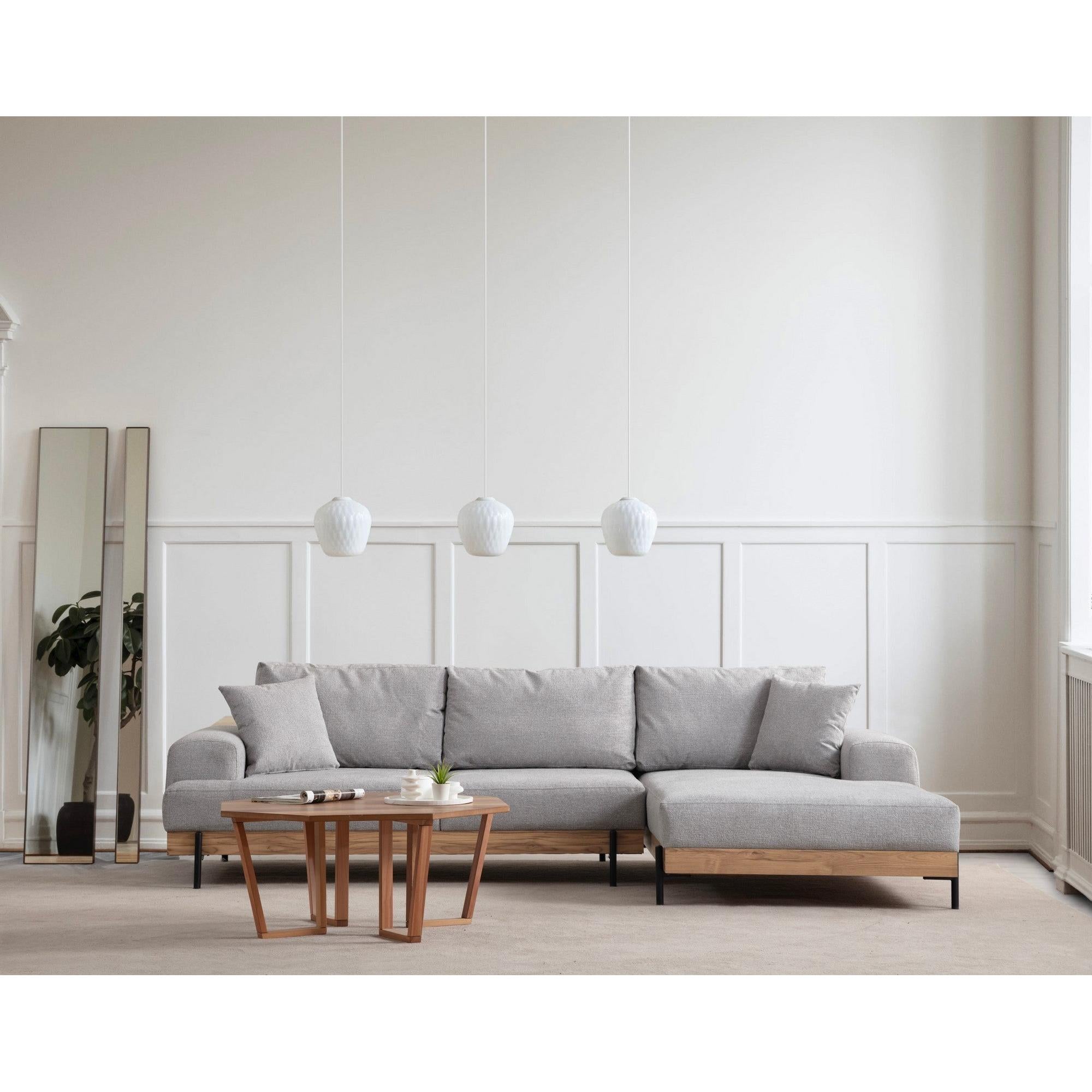 Elegáns és modern kialakításával sarokkanapénk tökéletes kiegészítője bármely nappalinak. A bükkfa és forgácslap váz nemcsak tartósságot biztosít, hanem egy kis kifinomultságot is kölcsönöz a térnek. A gyönyörű szürke árnyalatú, 100% poliészter szövet egy csipetnyi eleganciát kölcsönöz, így ez a kanapé bármelyik szoba középpontjává válik.