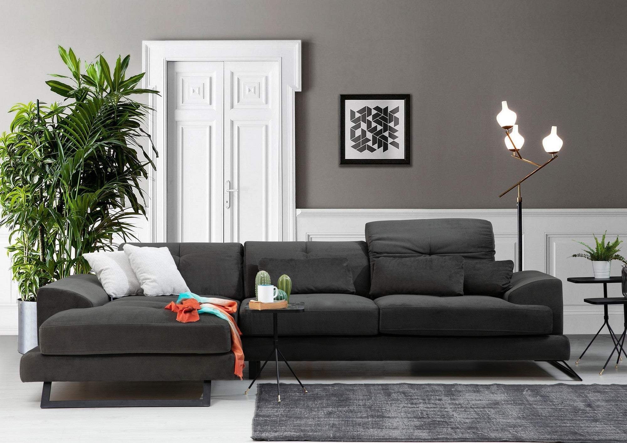 Bükkfából és forgácslapból készült, masszív vázzal készült sarokkanapénk tartósan megépített. A 100% poliészter szövet kifinomultságot kölcsönöz, míg a matt fekete fémlábak modern és ipari megjelenést biztosítanak.