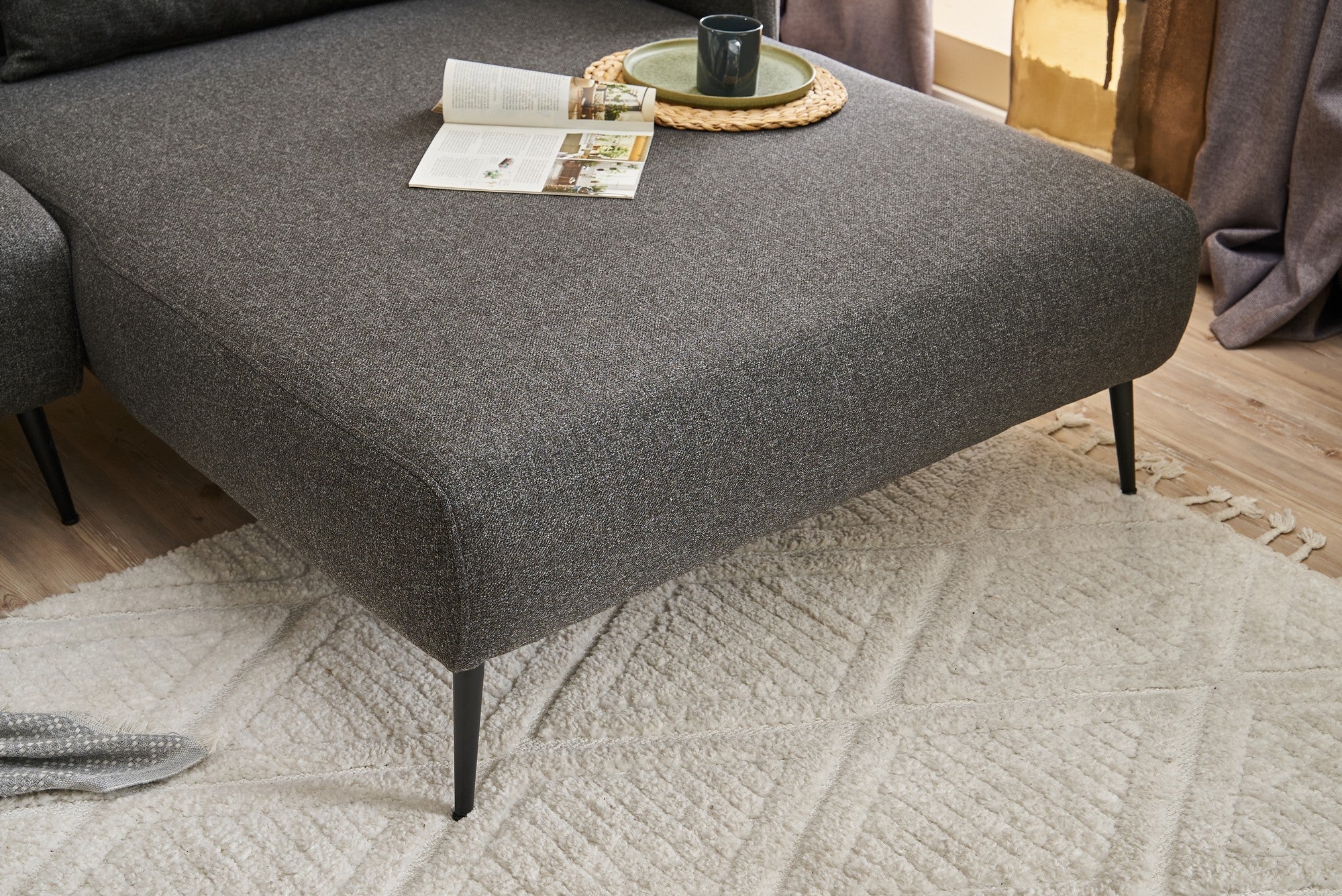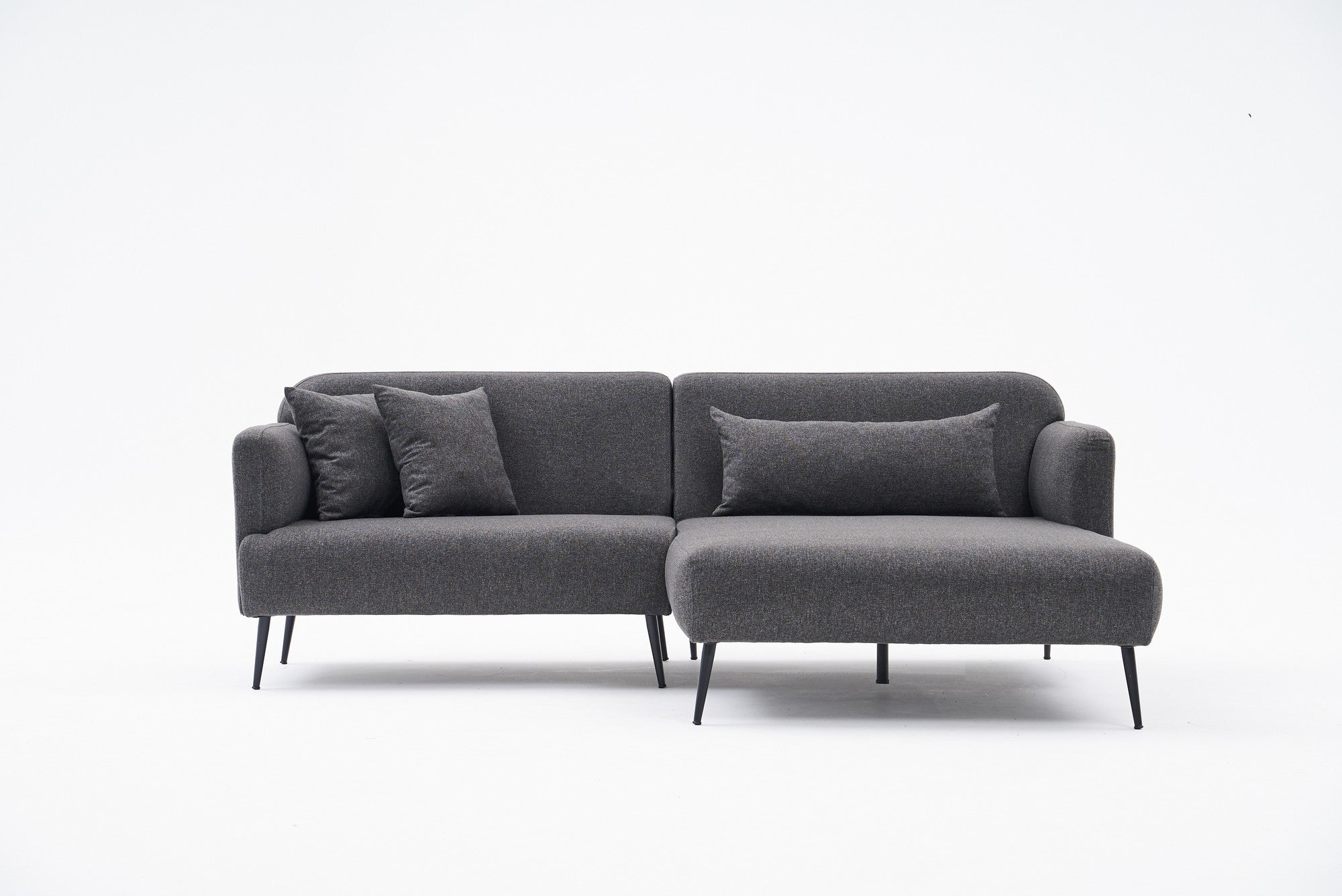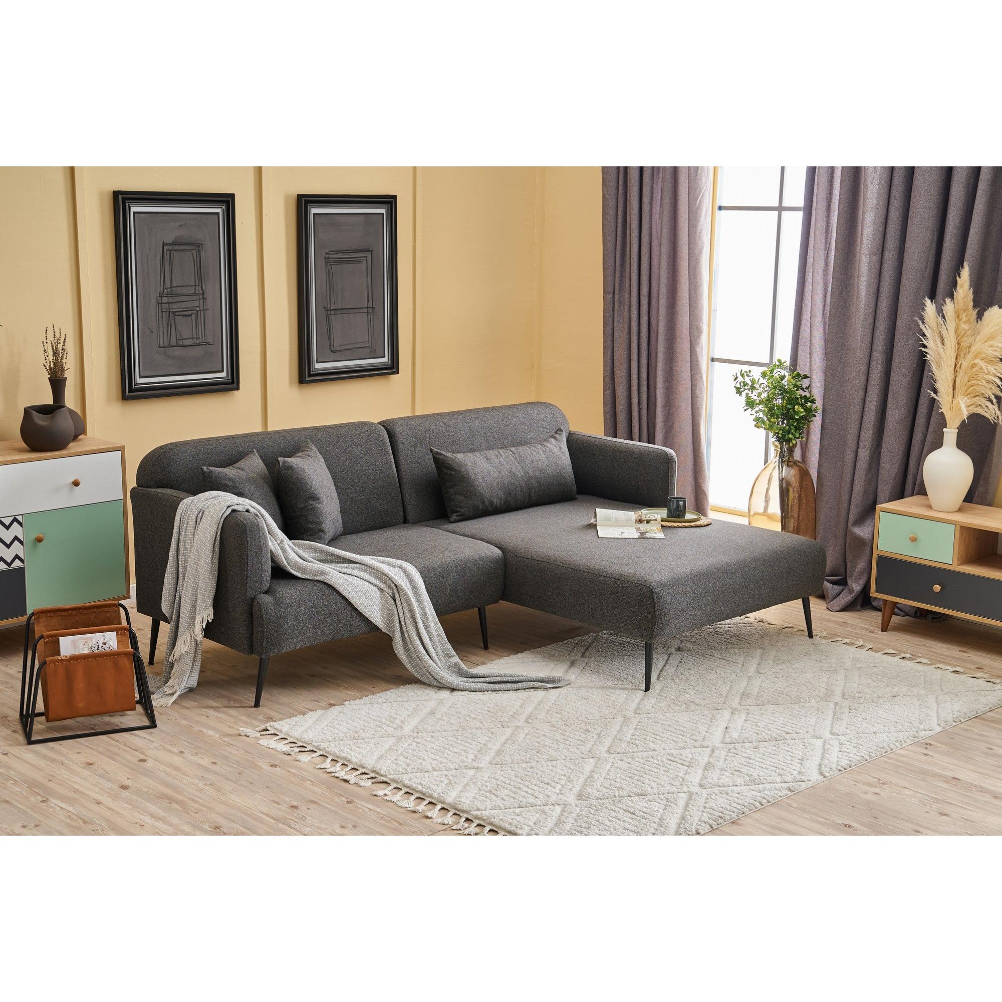 Ennek a sarokkanapénak a karcsú kialakítását fekete fémlábak egészítik ki, amelyek kortárs hangulatot kölcsönöznek bármely helyiségnek. A nagyvonalú, 250 cm x 86 cm x 100 cm-es méretek bőséges ülőhelyet biztosítanak Önnek és szeretteinek. A kanapé könnyen átalakítható 250 cm x 160 cm-es tágas ággyá is, így ideális éjszakai vendégek vagy lusta hétvégi lazuláshoz.