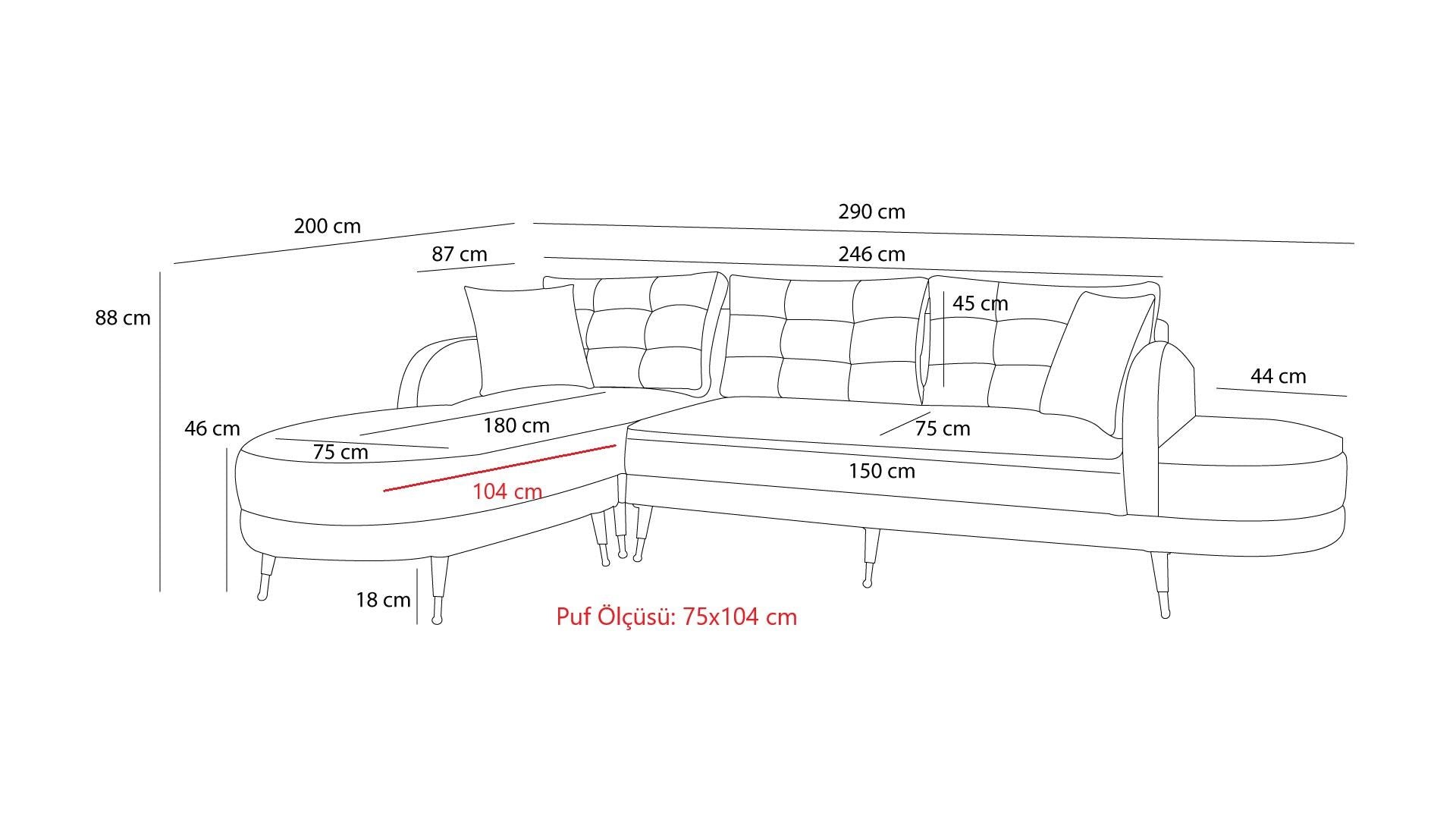- Szélesség: 290 cm, Magasság: 88 cm, Mélység: 200 cm