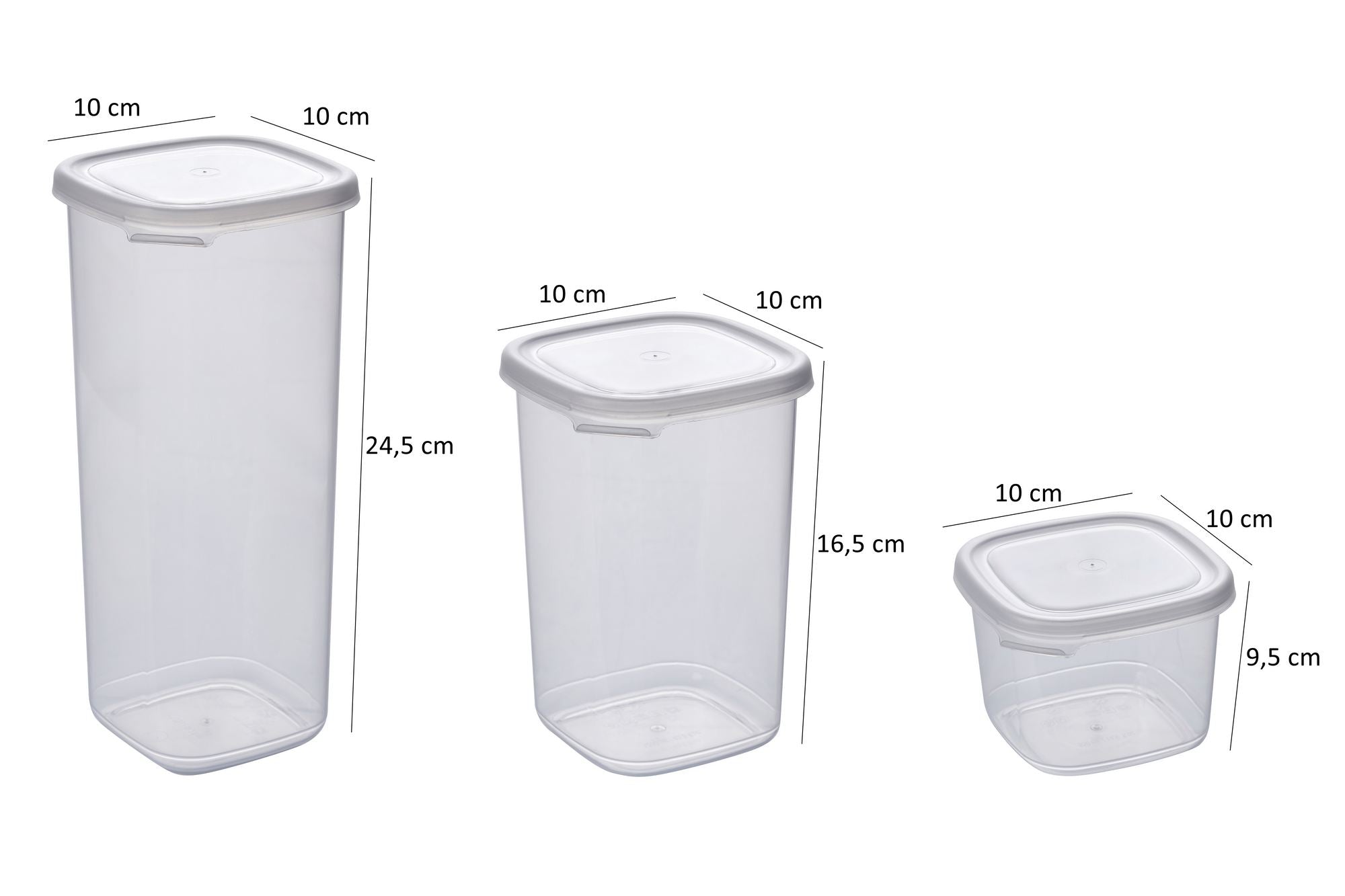 A készlet három különböző méretet tartalmaz a különböző tárgyak elhelyezésére. A 6 darab 10 x 10 x 9,5 cm/ 550 ml-es doboz tökéletesen alkalmas kisebb tárgyak, például ékszerek, irodai eszközök vagy fűszerek tárolására. A 6 darab 10 x 10 x 16,5 cm/ 1200 ml-es doboz kiválóan alkalmas rágcsálnivalók, maradékok vagy kisebb konyhai eszközök tárolására. A 6 darab 10 x 10 x 24,5 cm/ 1750 ml-es dobozok pedig ideálisak nagyobb tárgyak, például ruházati kiegészítők, játékok vagy éléskamrai alapanyagok tárolására.